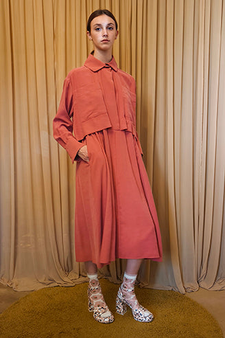 Abito chemisier in seta lavata terracotta composto da ampia gonna e colletto a camicia. Grandi tasche a toppa applicate sul davanti ed elastico in vita per regolarne la vestibilità. Tasche inserite nel fianco.