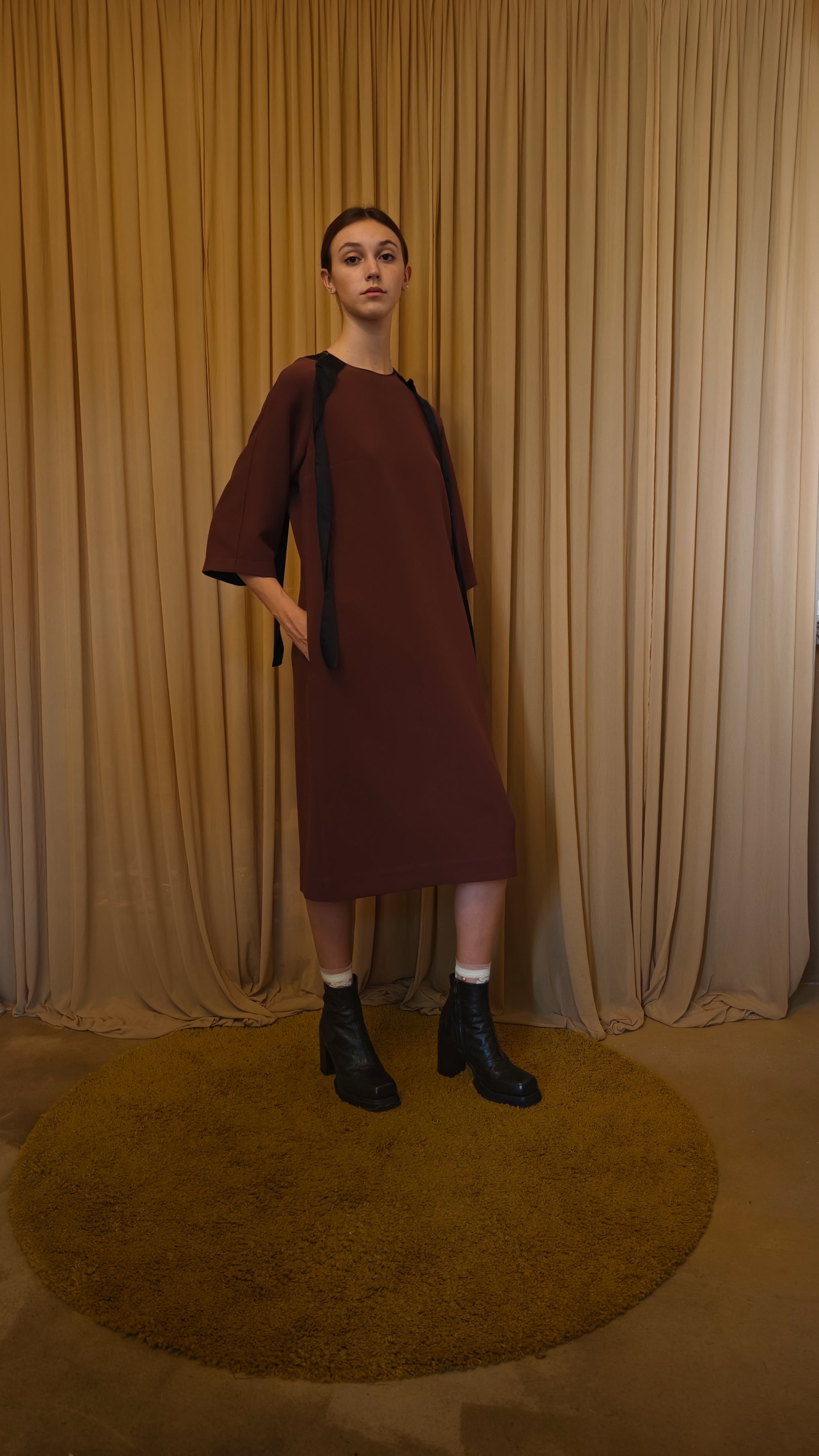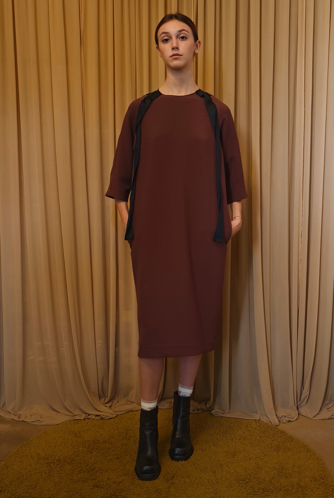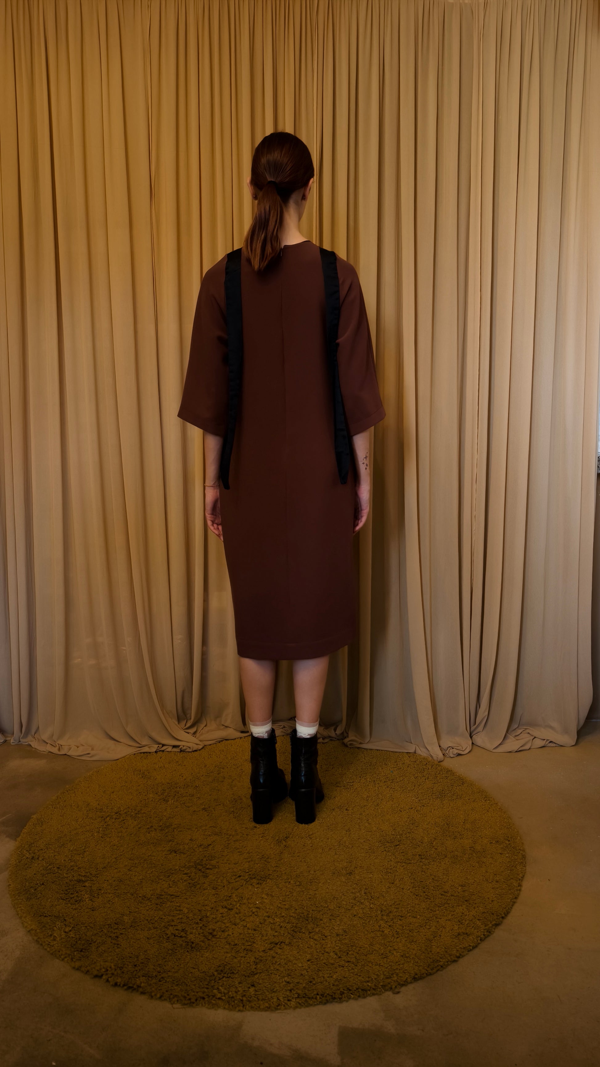 Abito midi girocollo in tessuto tecnico color castagna con fasce in raso nere a motivo sul davanti e sul dietro. Manica 3/4 e tasche inserite nei fianchi. Vestibilità dritta morbida.