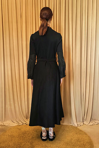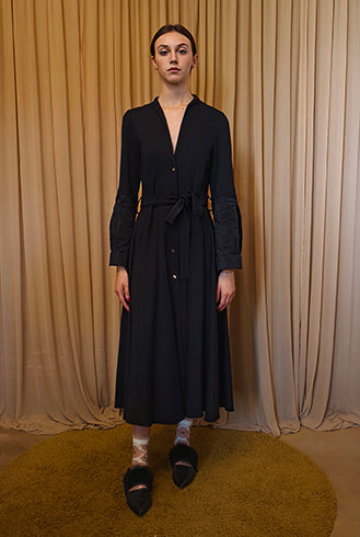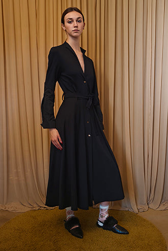 Abito midi in tessuto tricotina tinta unita con scollo a V. Chiusura a chemisier con bottoni a vista sul davanti. Particolare inserto delle maniche in taffetà tono su tono che terminano con polsino a camicia. Fusciacca tono su tono che si lega per definire il punto vita. Disponibile in verde salvia e asfalto in cotone smerigliato.