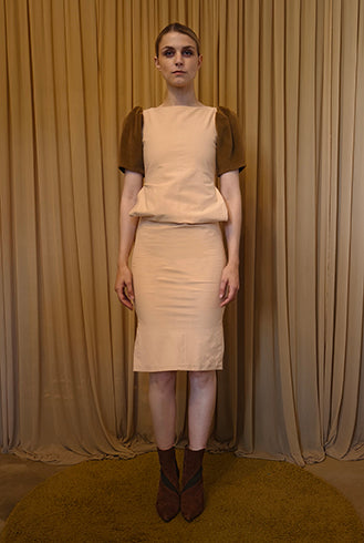 Abito tubino in cotone stretch con dettagli arricciati sui fianchi, maniche in velour color cammello.