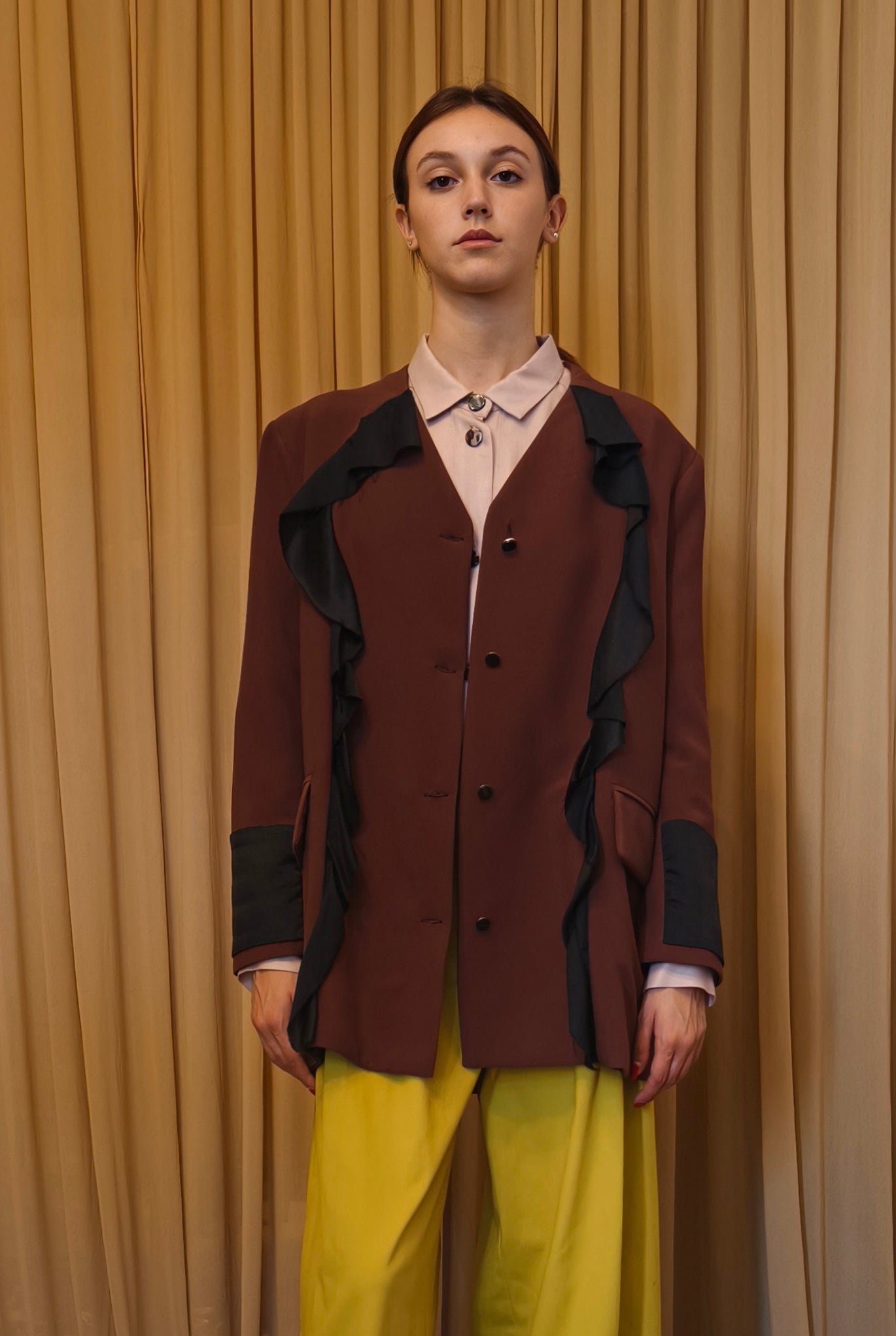Blazer senza collo in tessuto tecnico color castagna con inserti rouches sul davanti. Chiusura con bottoni a vista e tasche con patta sul davanti. Dettaglio delle maniche con martingala in raso nero. Vestibilità over dritta.