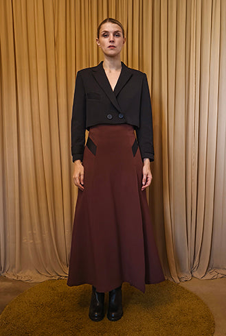 Giacca cropped doppio petto in tessuto tecnico con collo a lancia e maniche arricchite da martingala.