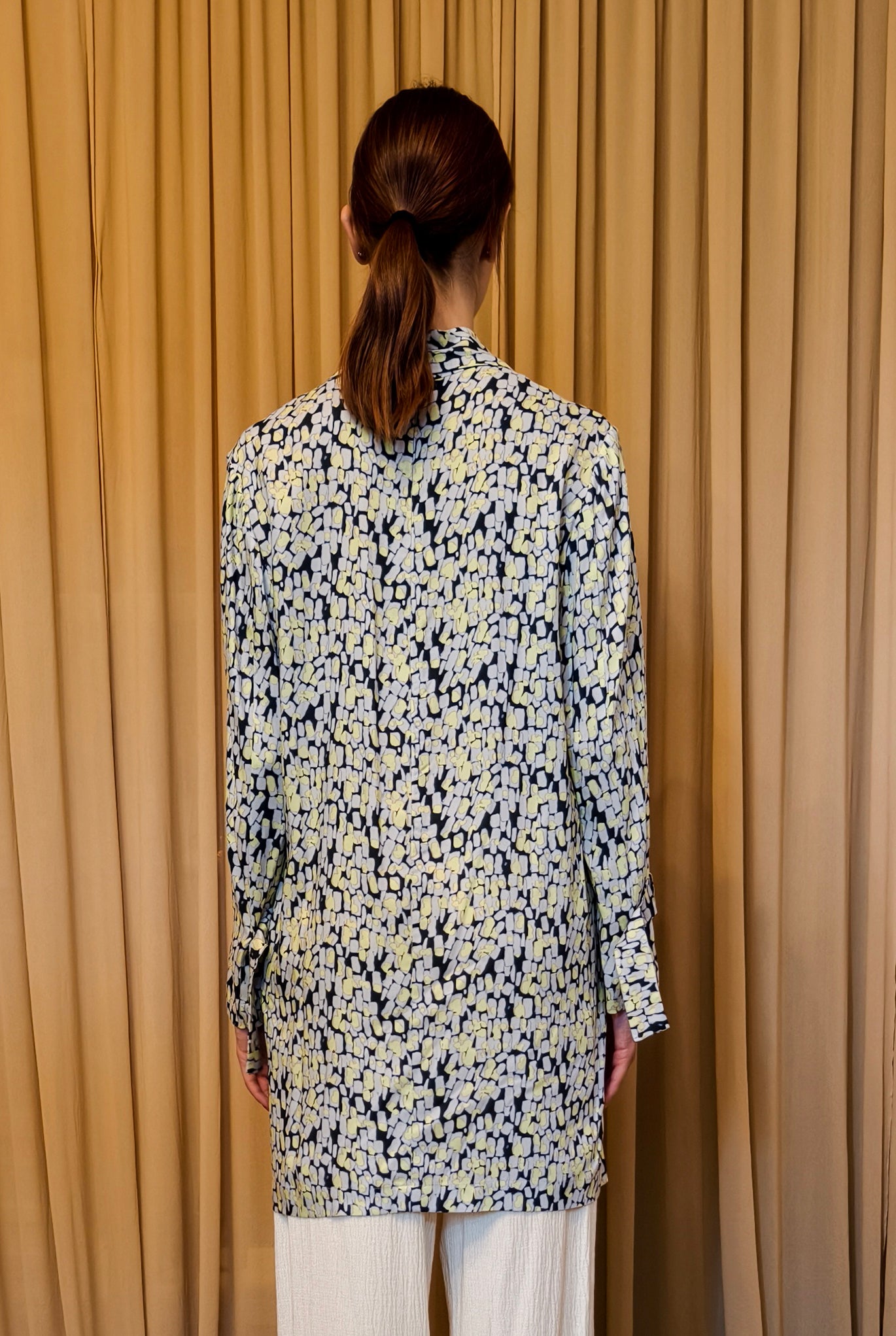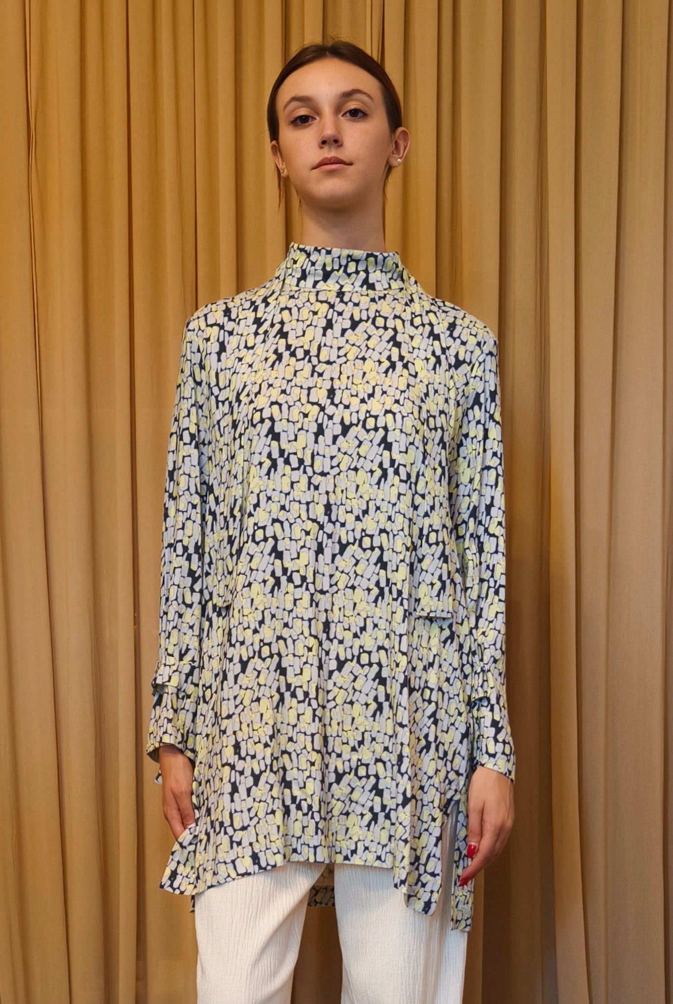 Blusa maxi in twill stampato, con mostrine sui polsi in tinta, indossabile anche come mini dress con una calza super coprente.