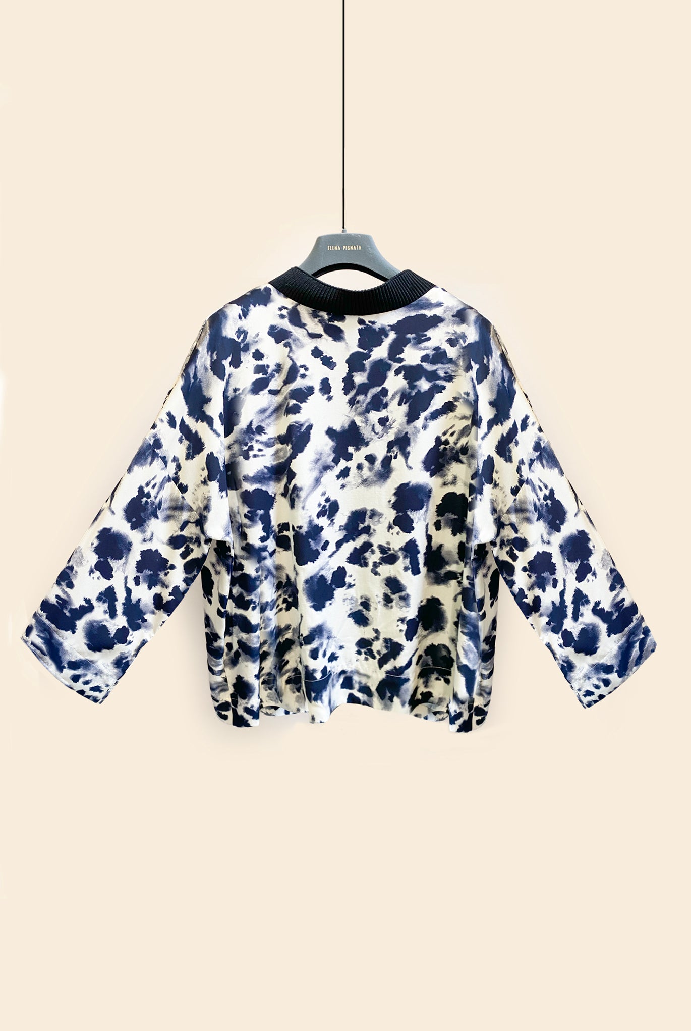 Blusa in viscosa fluida con stampa brushed inchiostro su base naturale. Collo in maglia, da abbinare al suo pantalone flare.