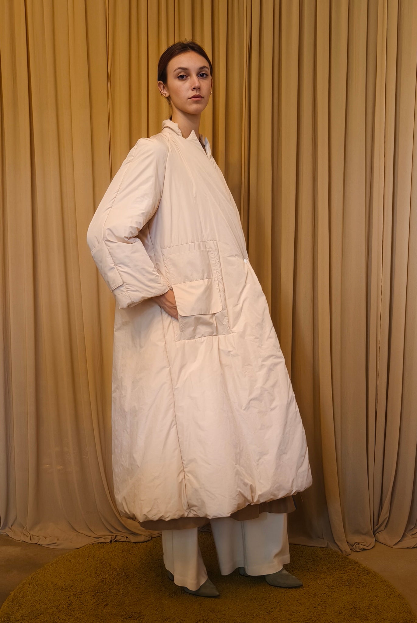 Cappotto over imbottito in nylon color ecru con vestibilità a trapezio. Spalla scesa, collo con revers classico, maxi cavalca chiusa con bottone bianco. Tasche oblique a filetto con dettaglio della tasca destra quadrata con patta. Rifinitura delle maniche con martingala in nylon tono su tono ed etichetta toppa con logo Ombradifoglia sulla manica sinistra. Spacco nel centro dietro.
