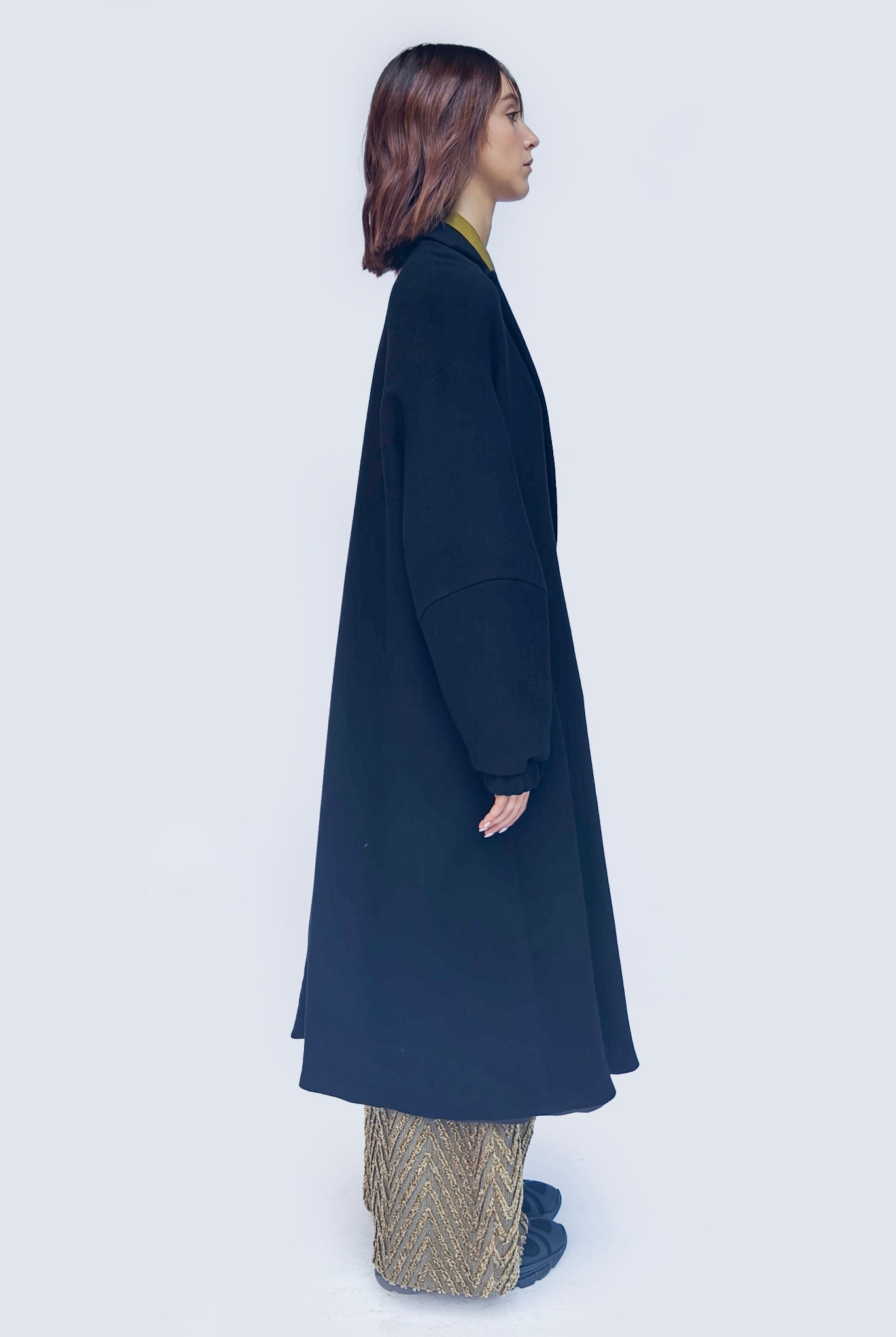 Cappotto over total black con maniche lunghe lantern. Tasche inserite sul fronte, chiusura frontale con bottone a scomparsa.