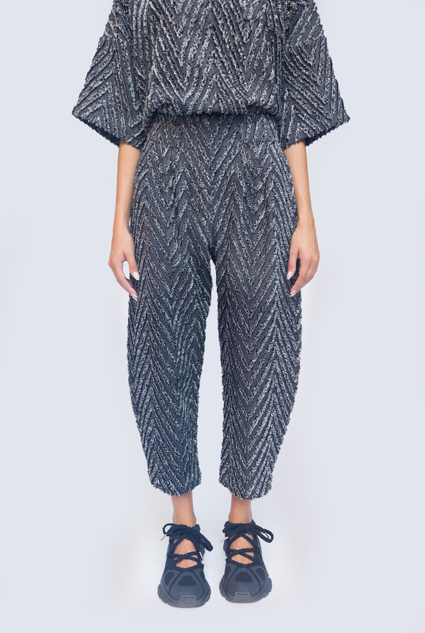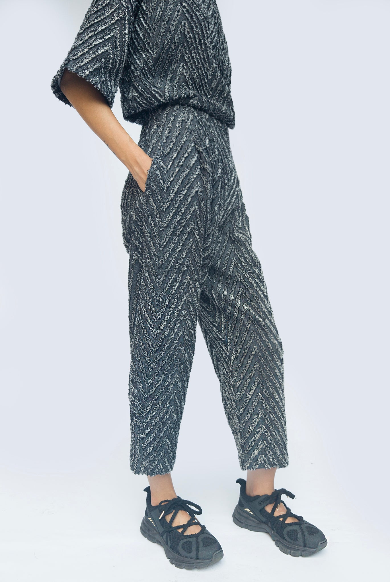 Pantalone in tessuto spigato black and white. Vestibilità morbida, stringono leggermente sulla caviglia. Due tasche inserite sul fronte. Passanti in tessuto spigato. Zip davanti.