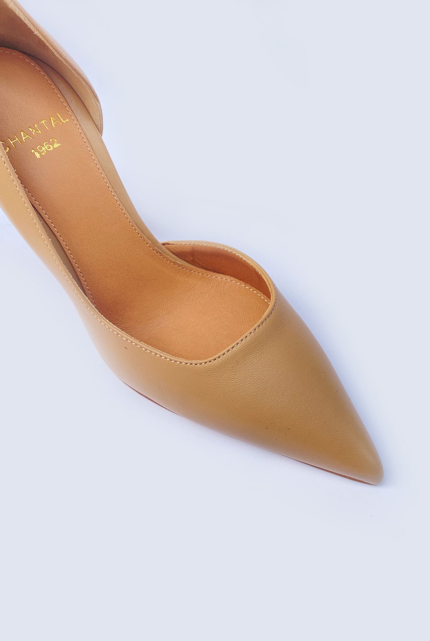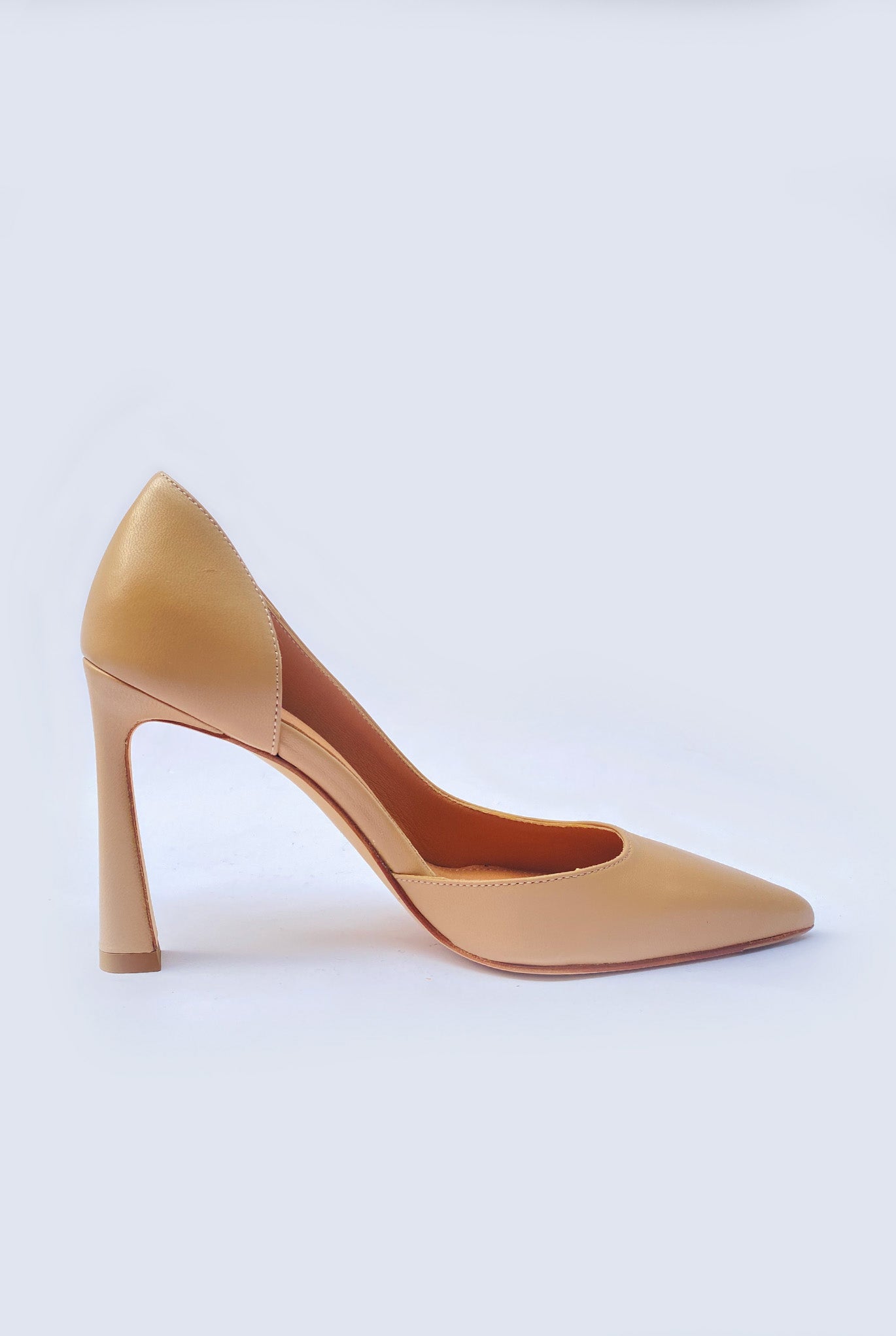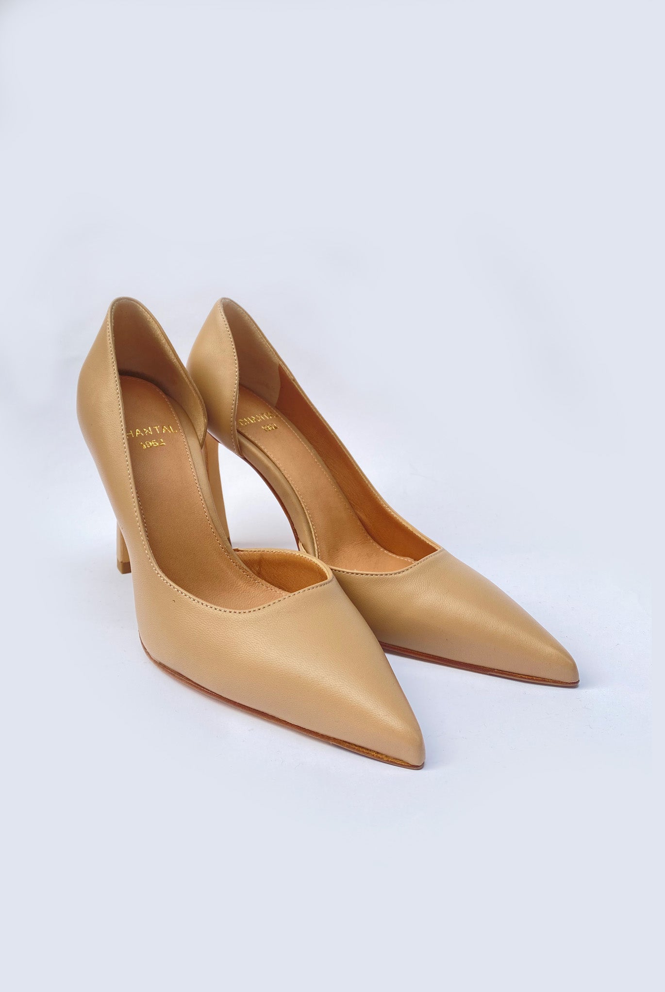 Décolleté color crema dalla punta affusolata, realizzata in morbida pelle naturale con suola in cuoio, tacco a stiletto di 9,5 cm e apertura laterale.