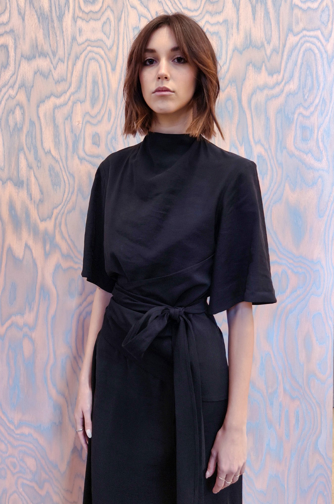 Vestito longuette in seta lavata color nero. Collo alto e maniche a kimono a ¾ , cintura in vita nello stesso tessuto. Zip sul retro.