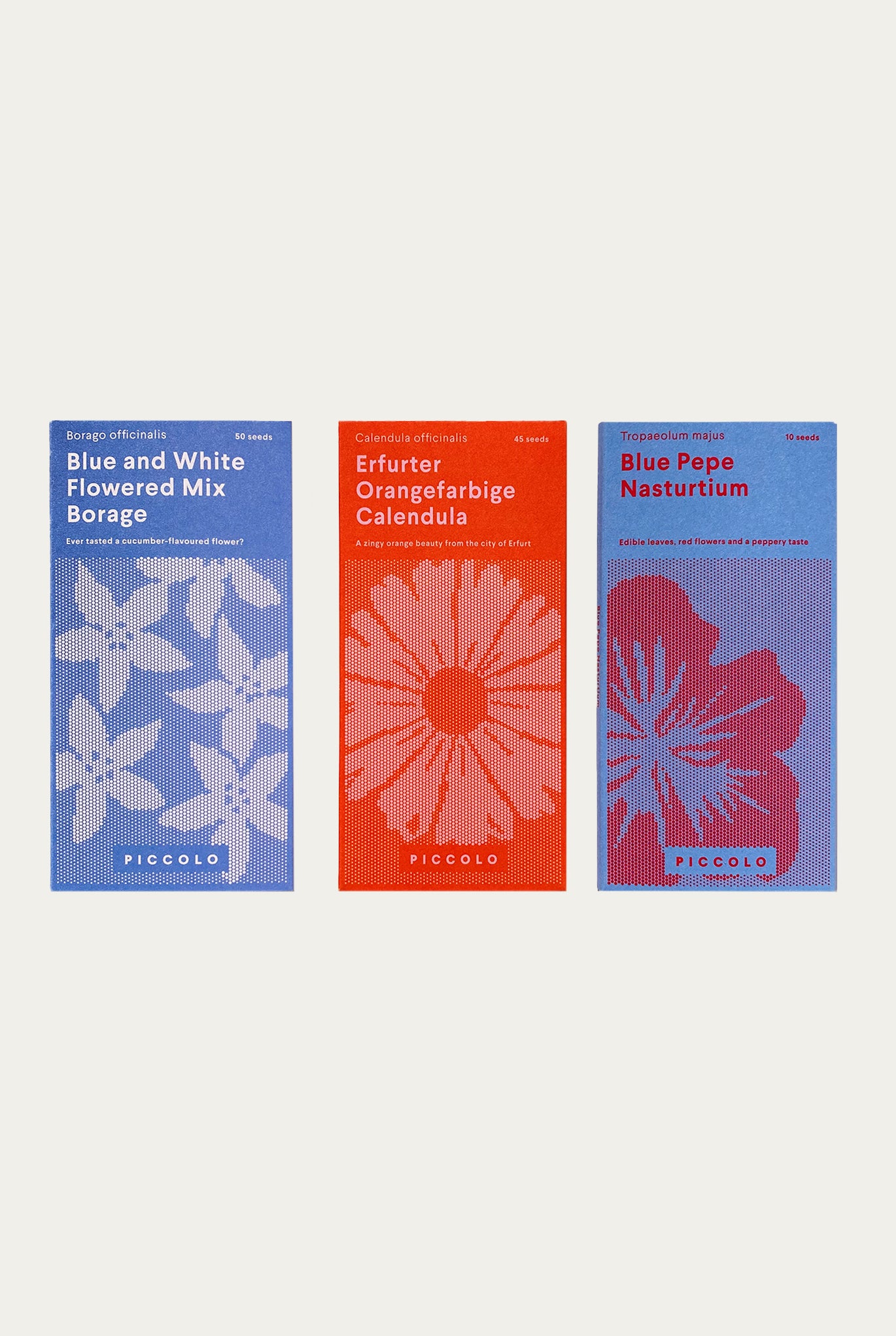 All’interno troverai tre bustine di semi per coltivare a casa la borragine a fiori blu e bianchi, la calendula Erfurter Orangefarbige e il nasturzio Blue Pepe. Perfetti per portare colore e gusto in cucina.