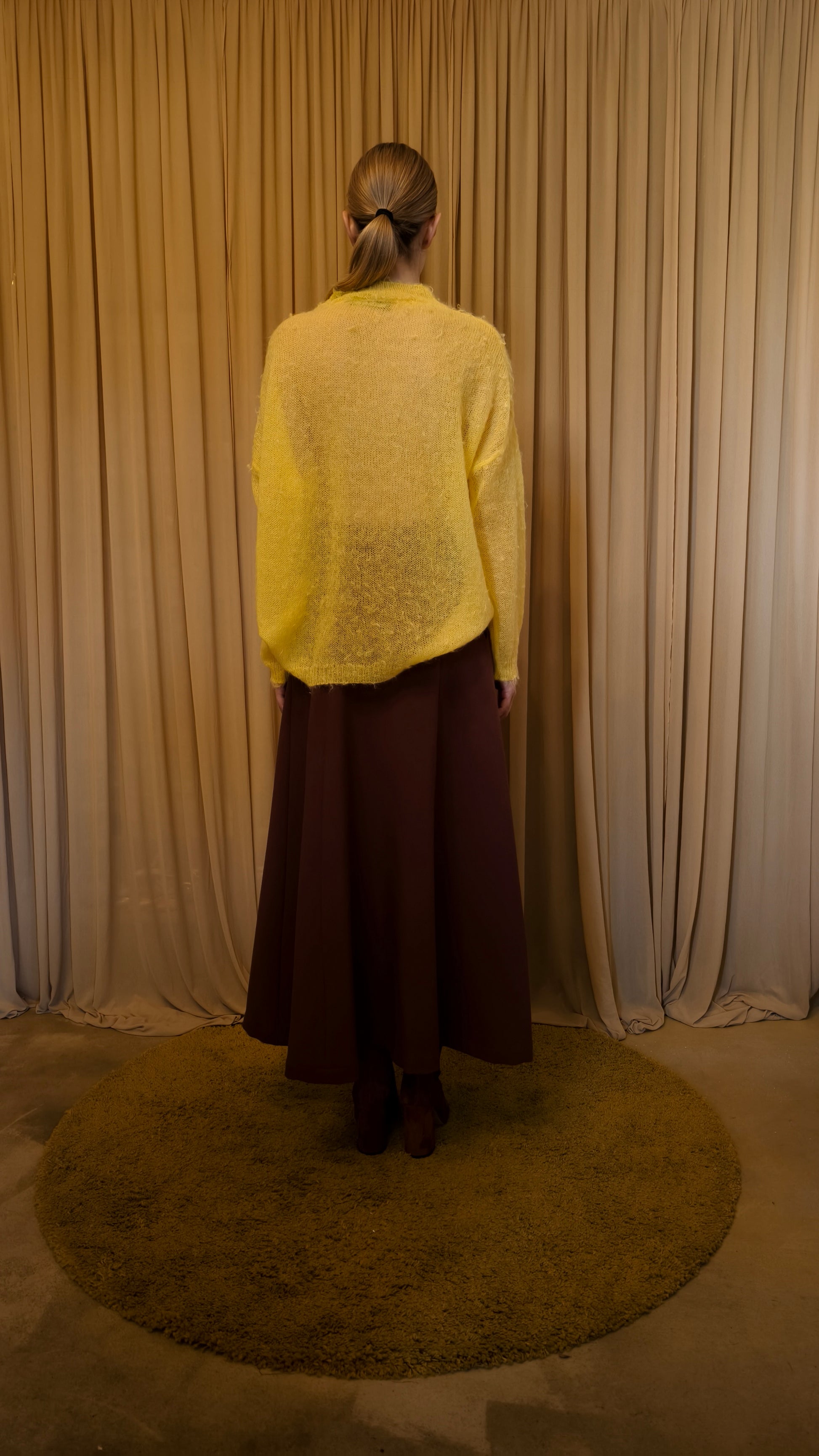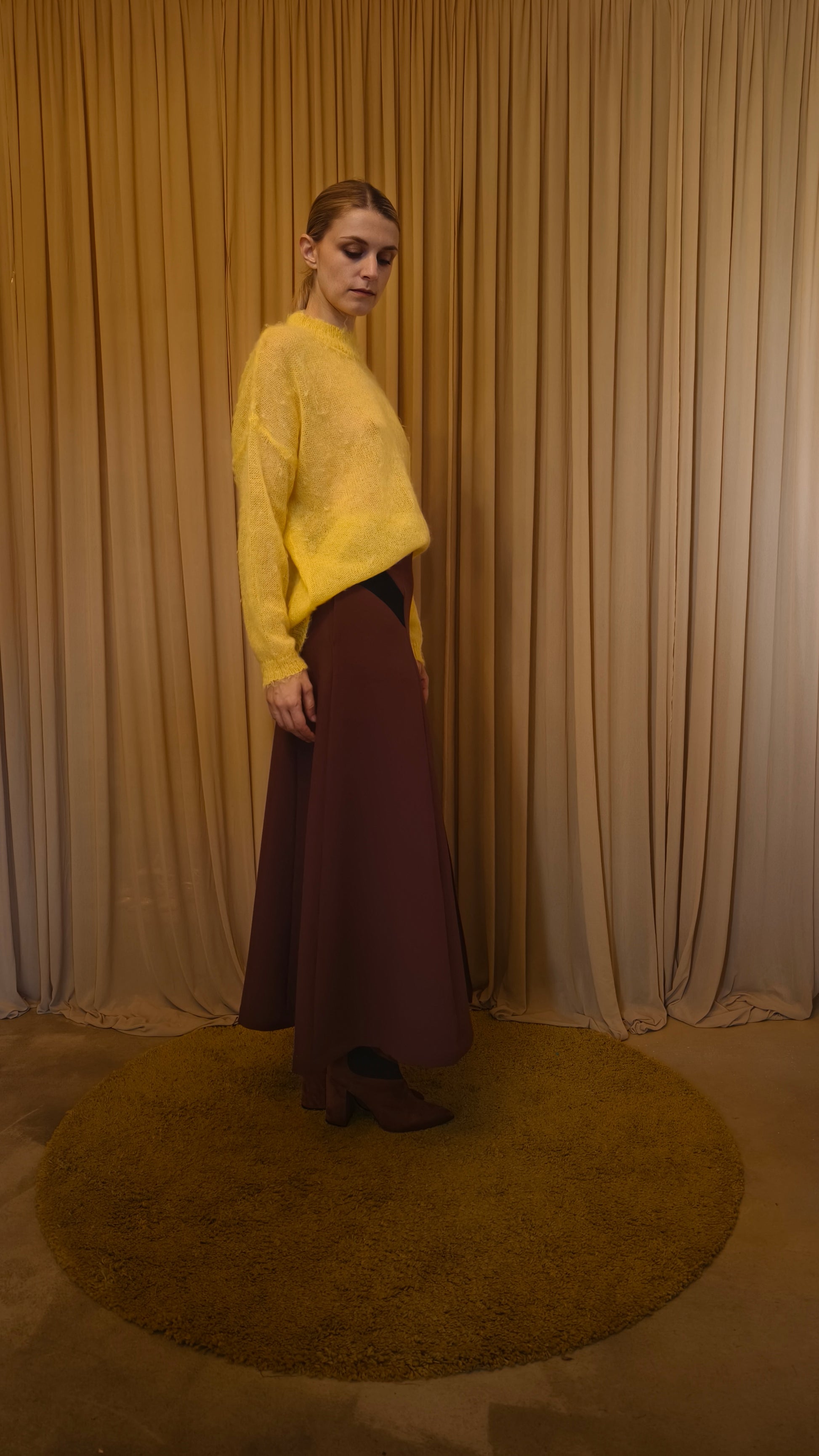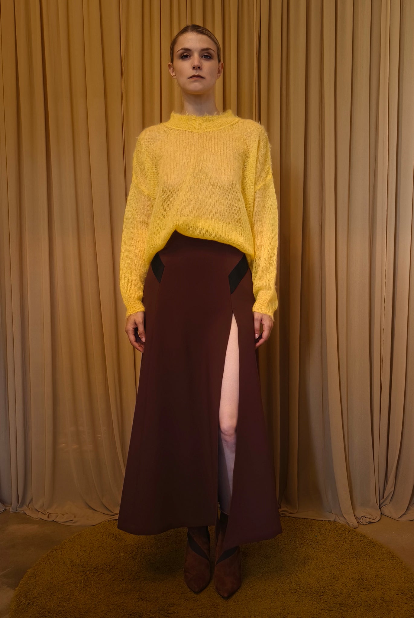Gonna a vita alta in tessuto tecnico color castagna con ampio spacco sul davanti. Inserti in raso nero e apertura tramite zip invisibile sul dietro.