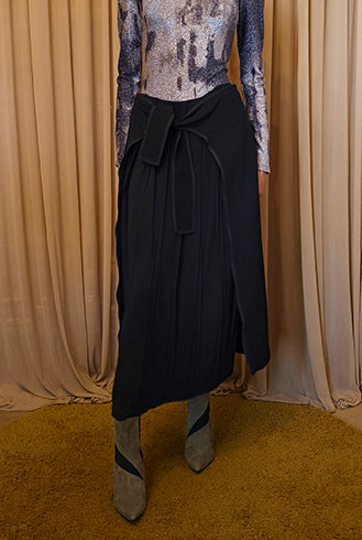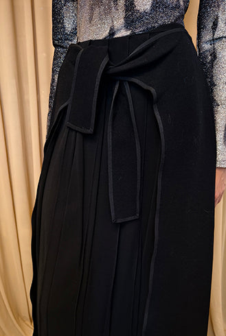 Gonna lunghezza midi in flanella di lana e viscosa a pieghe sul davanti con pannello double da annodare a vita. Apertura con zip invisibile nel centro dietro.