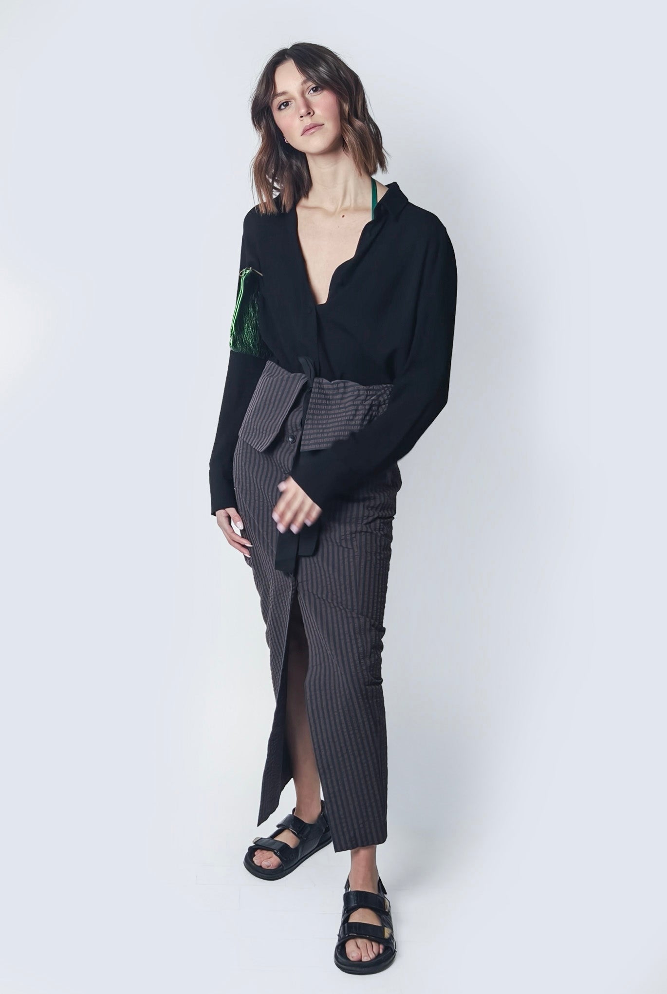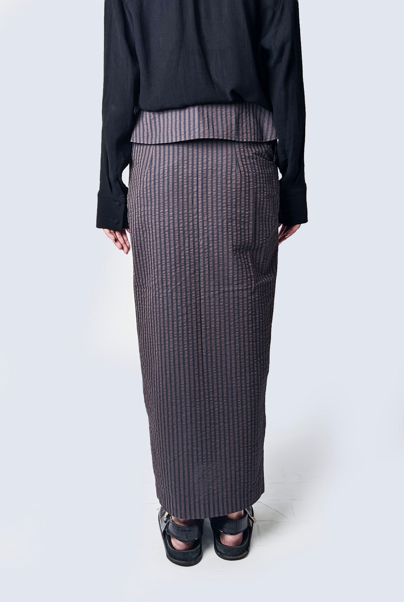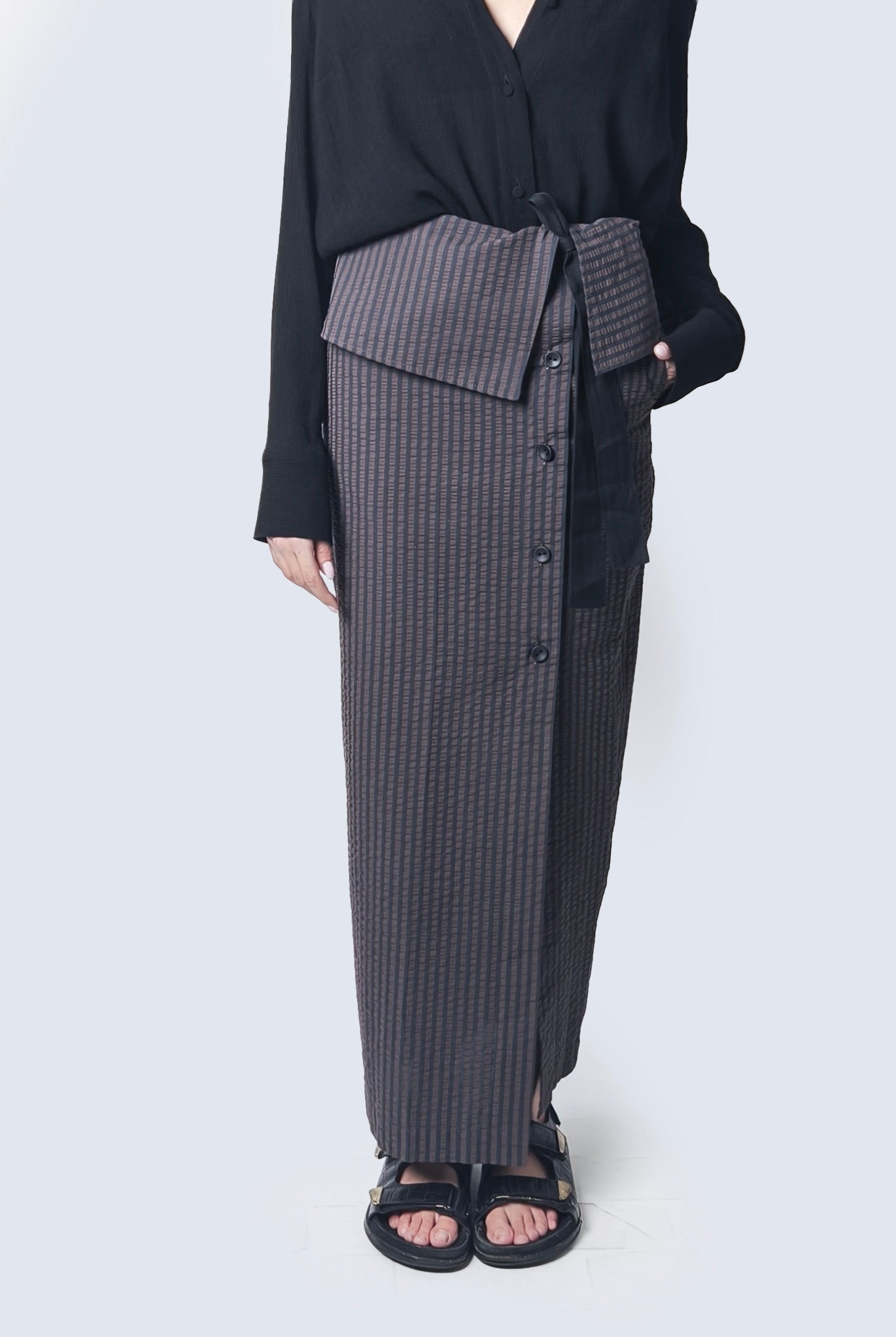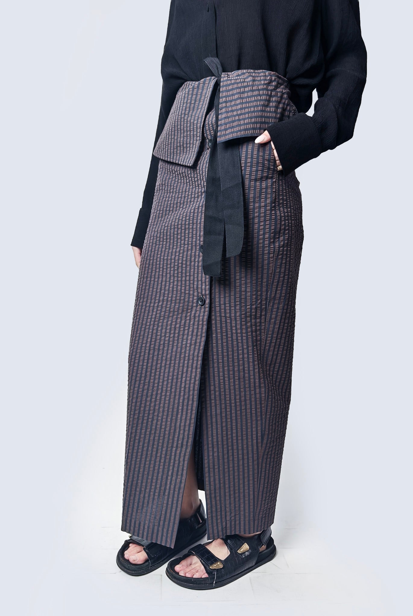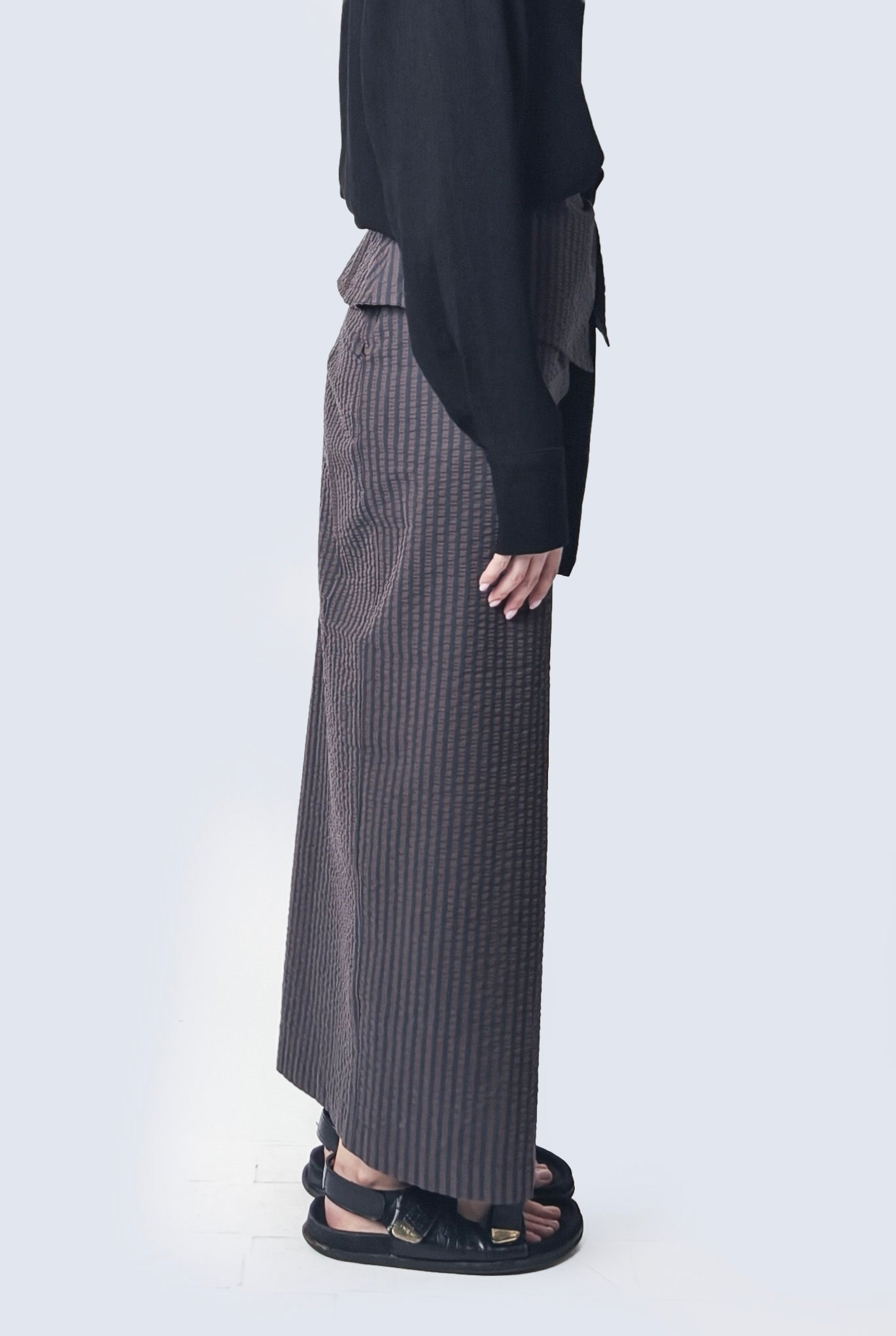 Longuette in seersucker becchettato sui toni del brown/black su una base tessuto goffrata. Ampio risvolto in vita, chiusura frontale con bottoni, patta asimmetrica e nastro da annodare in vita.