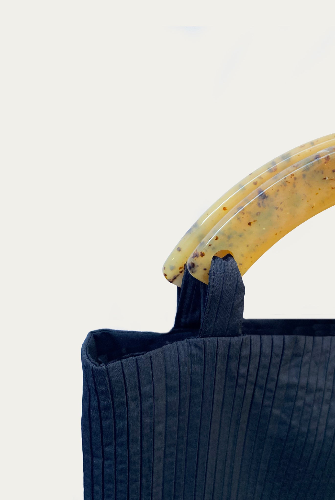 Nessuno scarto. Questa Bag total black dal design squadrato è realizzata con gli avanzi di tessuto, realizzata a mano, con manici rigidi in resina.