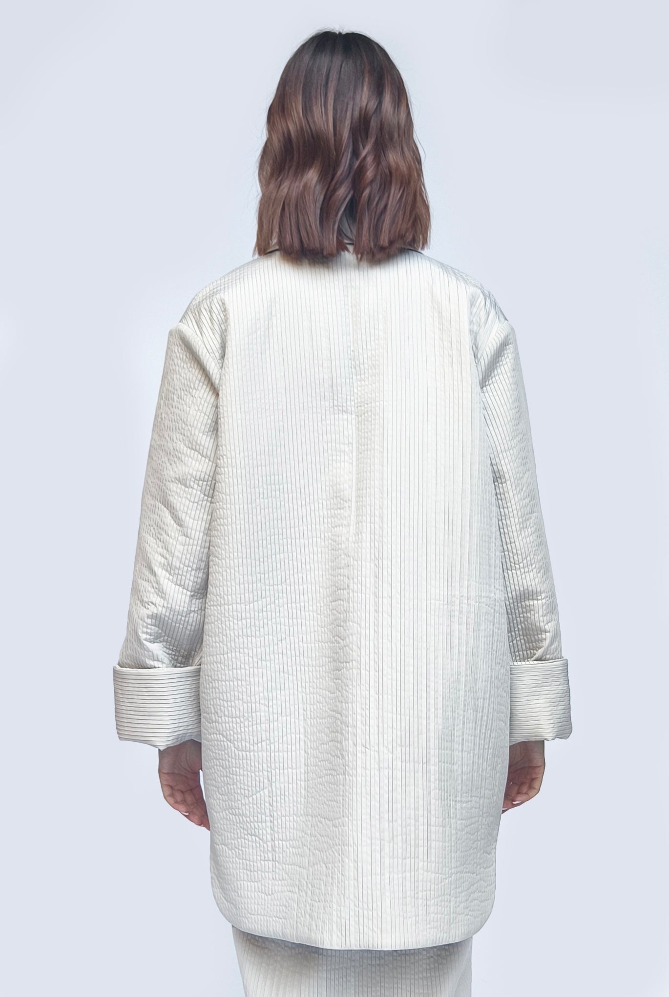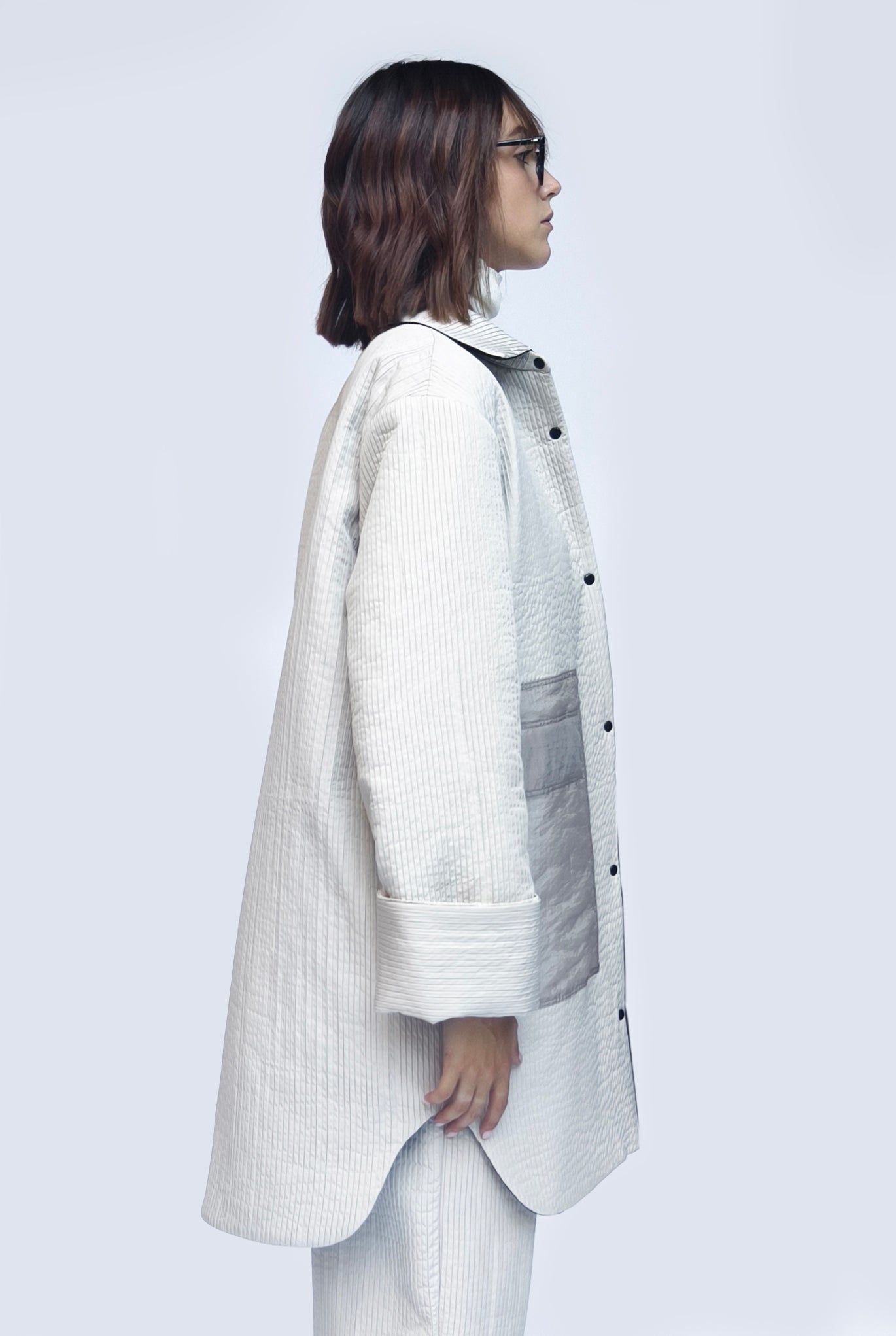 Jacket maxi shirt in in tessuto organetto color naturale. Chiusura frontale con bottoni a pressione neri.