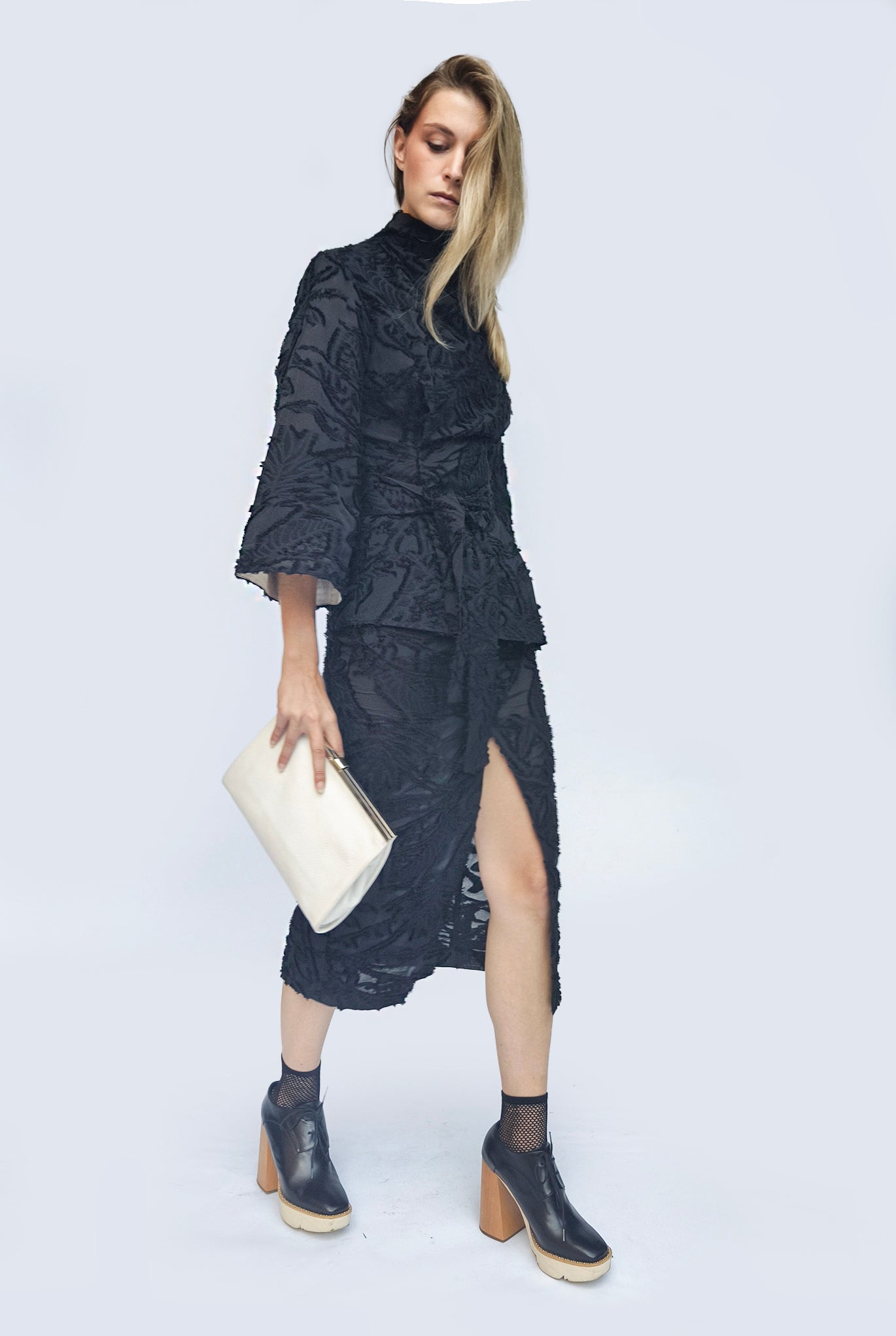Vestito in fil coupé color nero. Collo alto e maniche a kimono a ¾ e cintura in vita nello stesso tessuto. La gonna longuette ha un profondo spacco sul davanti. Zip sul retro.