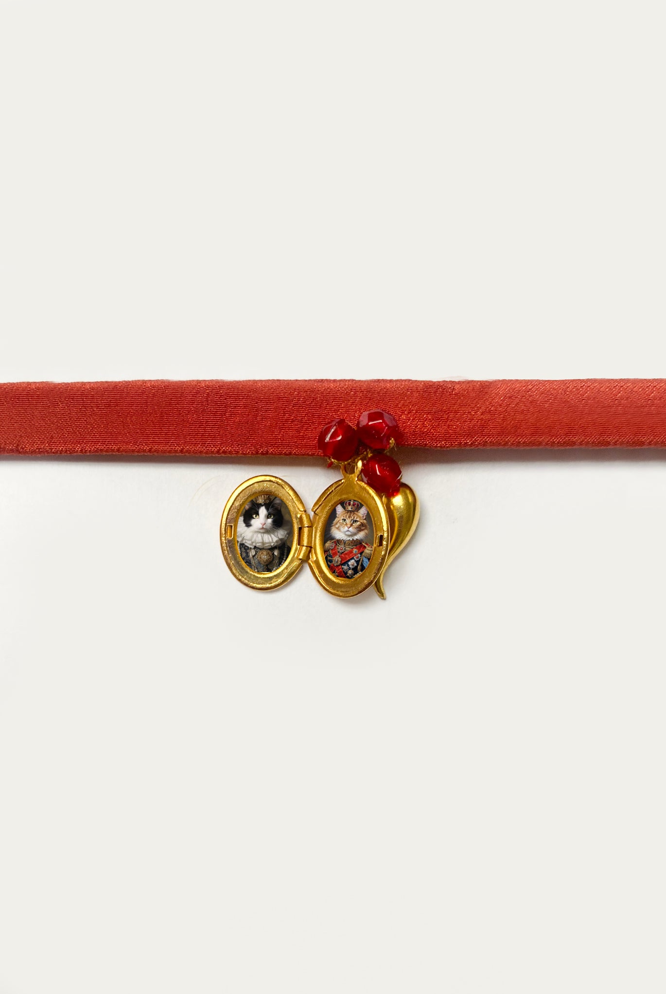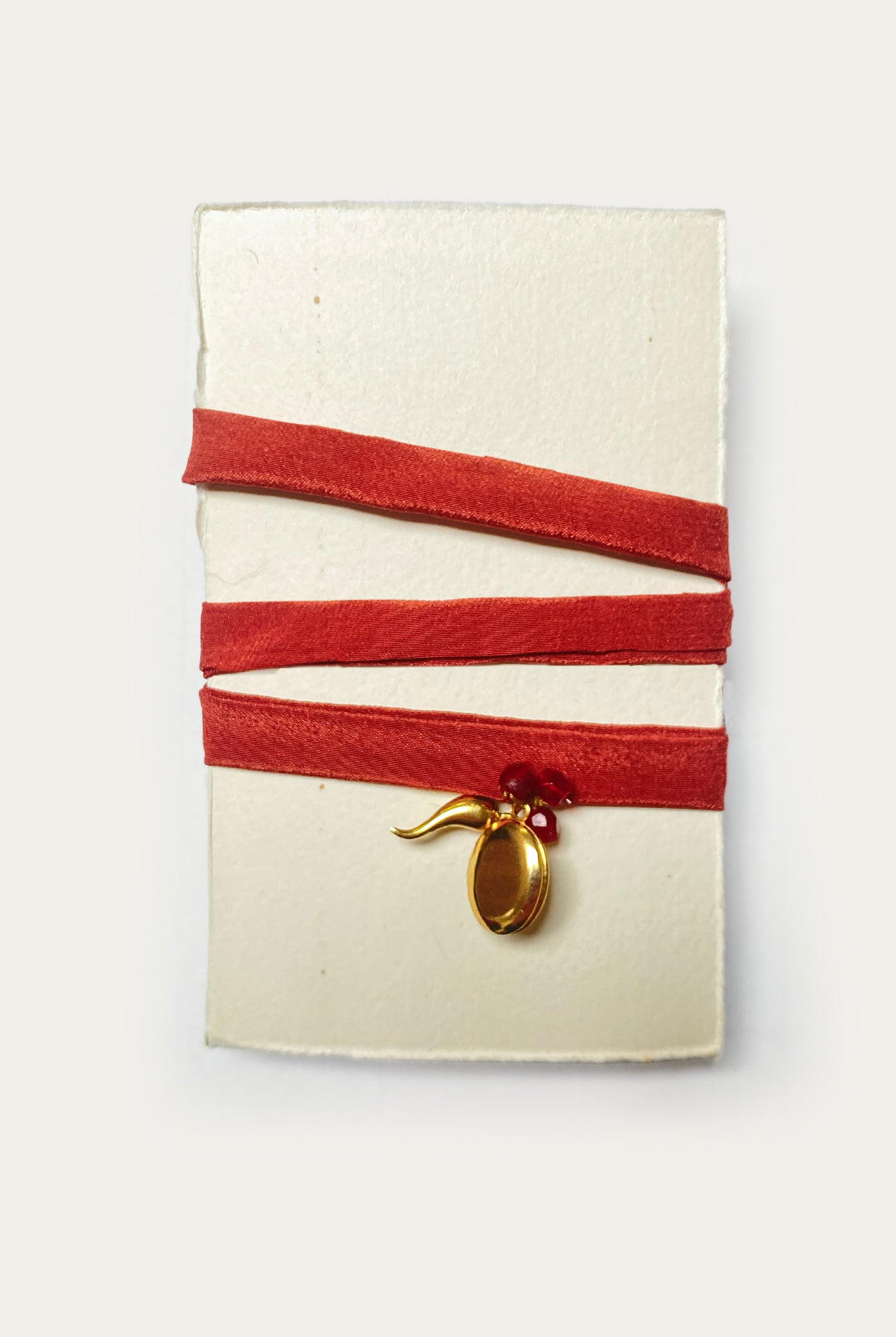 Bracciale / ciocker in tubolare di seta oro, con finali dorati- Piccolo strass verde smeraldo, piccola conchiglia dorata e scrigno per inserire le foto del vostro amat*, sia esso un umano, un personaggio immaginario o più banalmente un umano in carne e ossa.