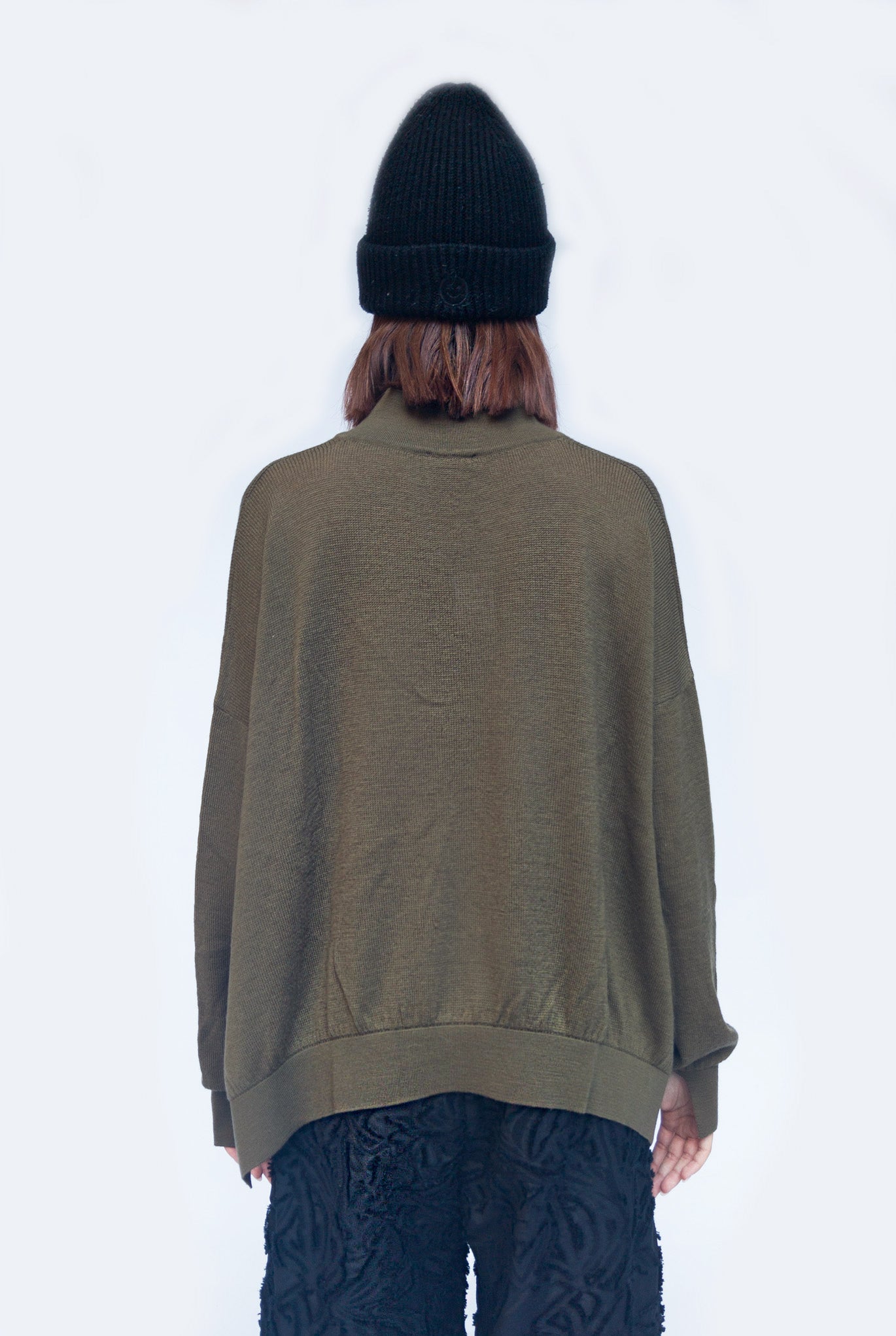 Maglia in lana color kaki con scollo V. Maniche lunghe, con piccolo spacco sul polsino. Vestibilità morbida.
