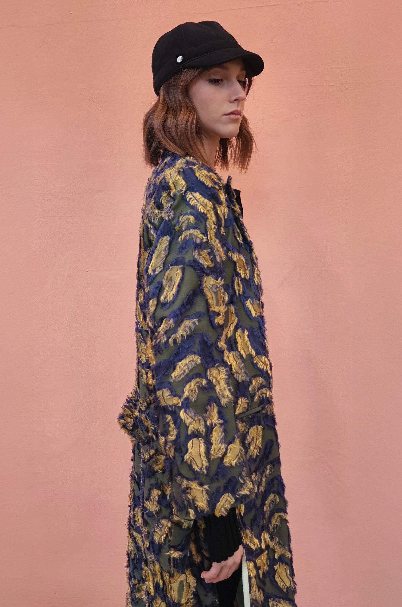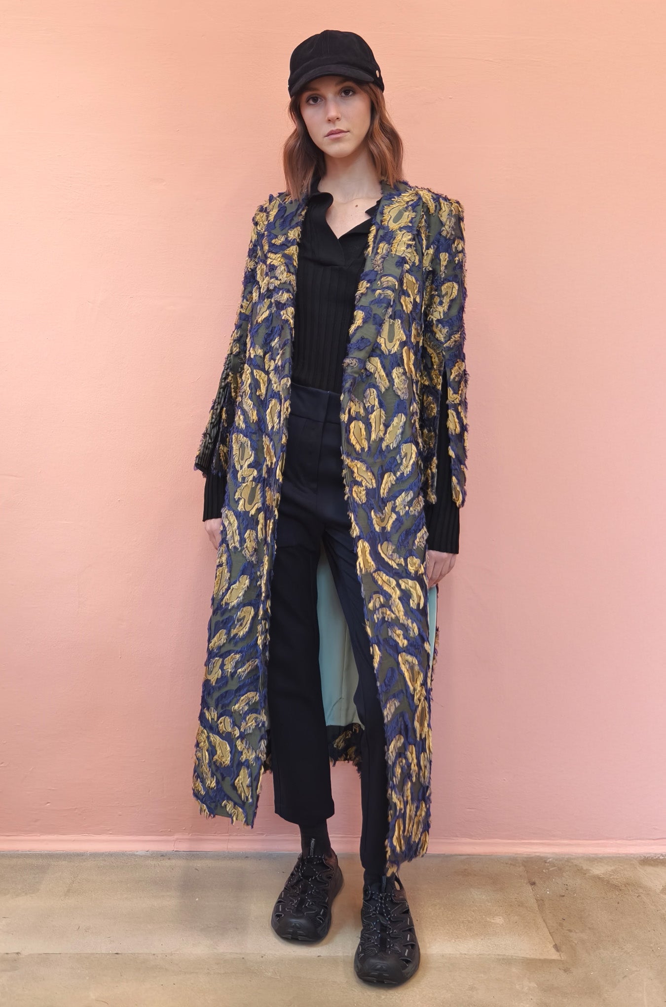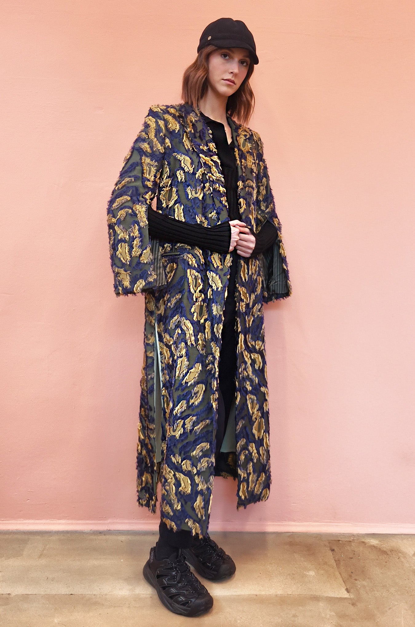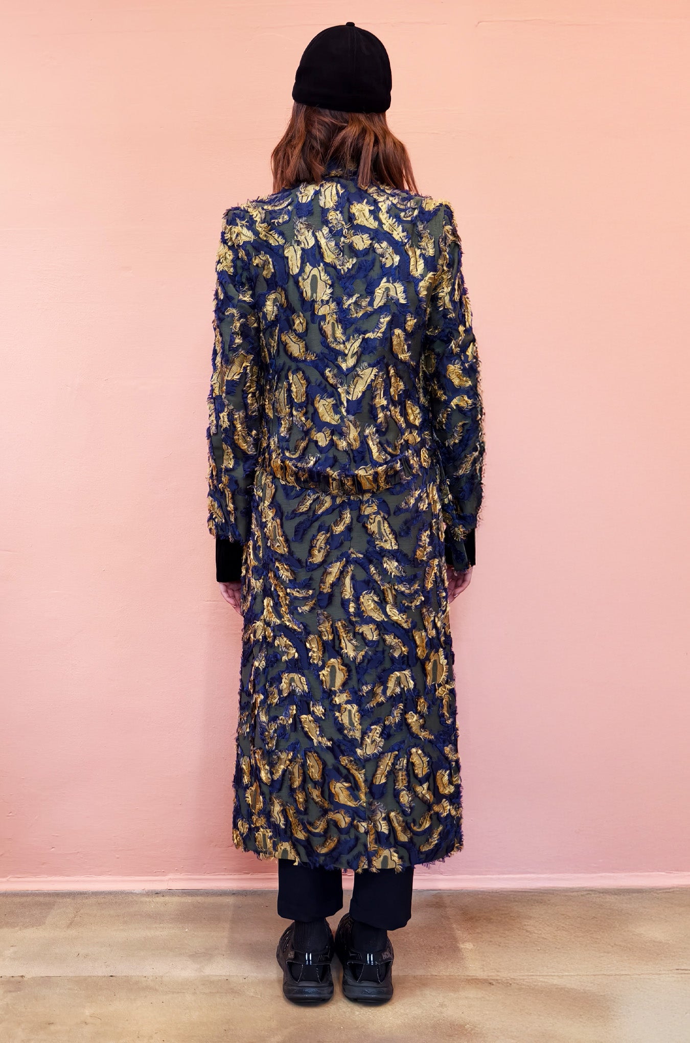 Spolverino in fil coupè sui toni del blu e oro. Ampio rever e spacchi sulle maniche, cintura in vita.