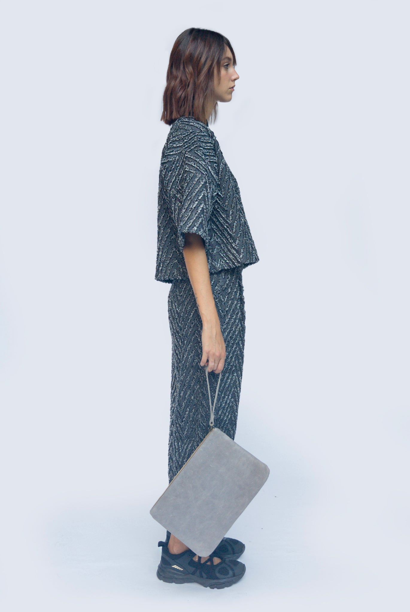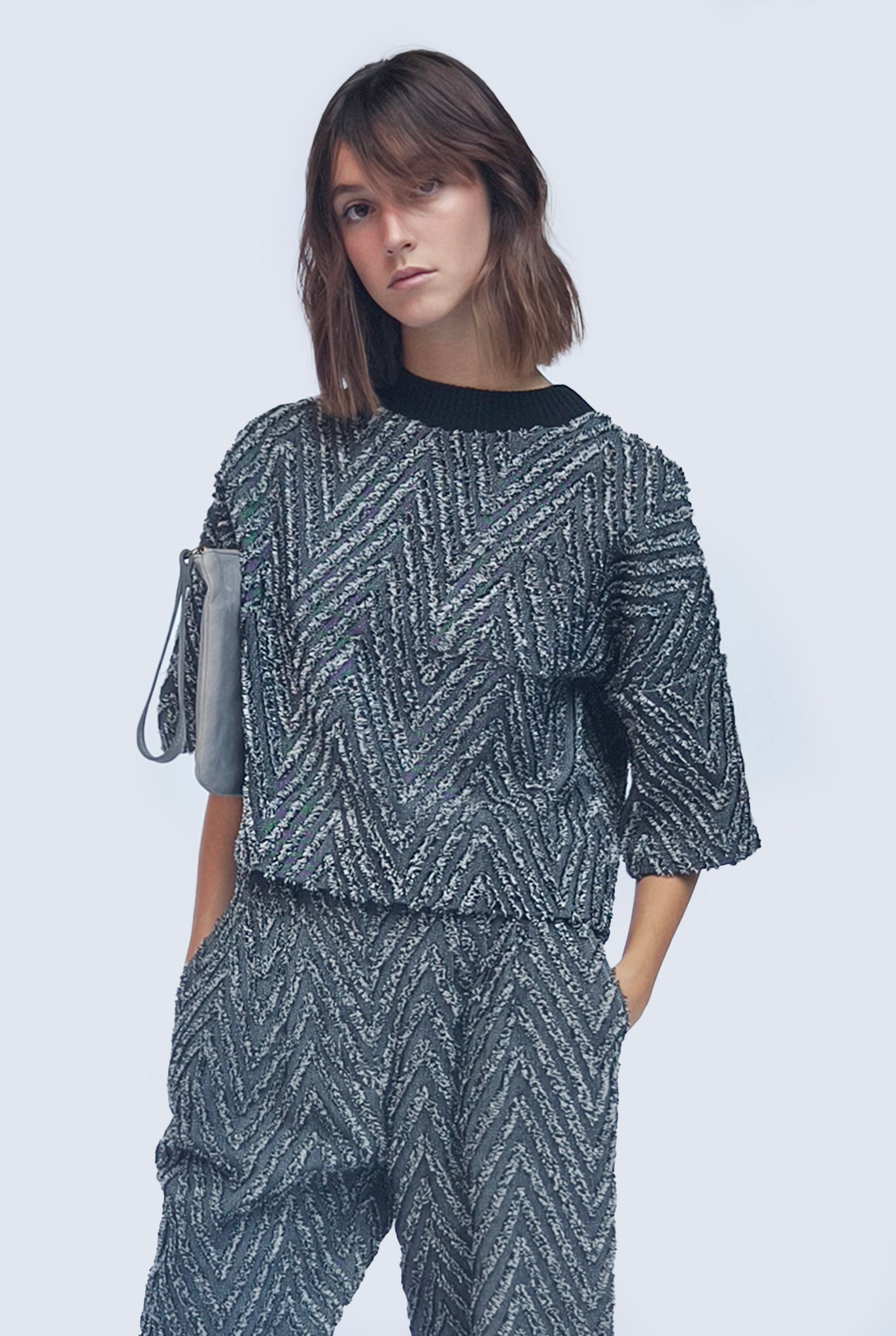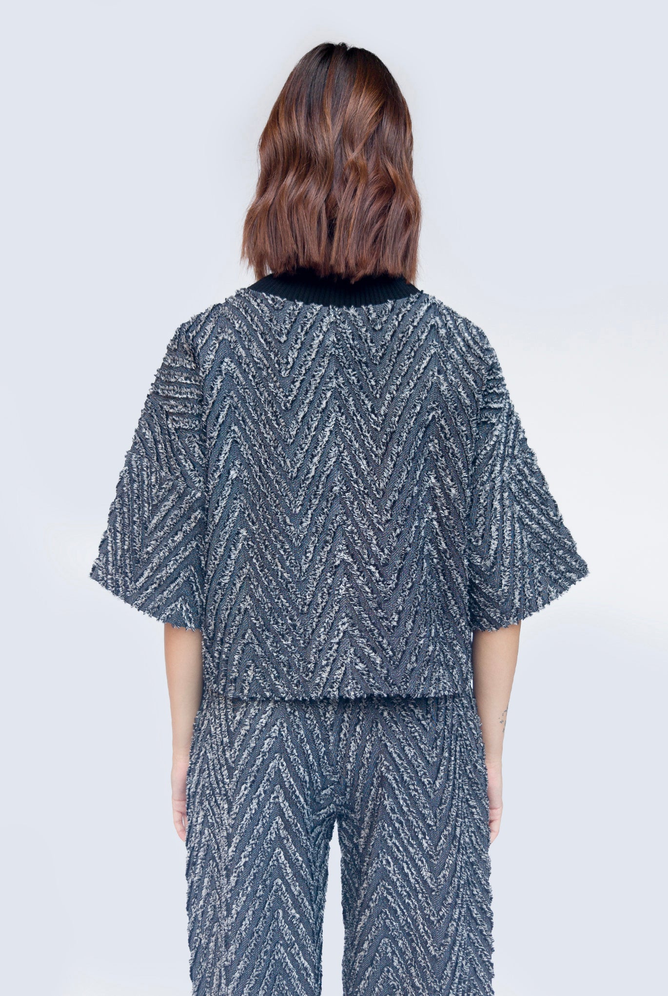T-shirt black and white in tessuto spigato macro resca. Collo a contrasto in costina, spalla scesa e manica kimono. Pijiamas effect abbinata al suo carrot pants.