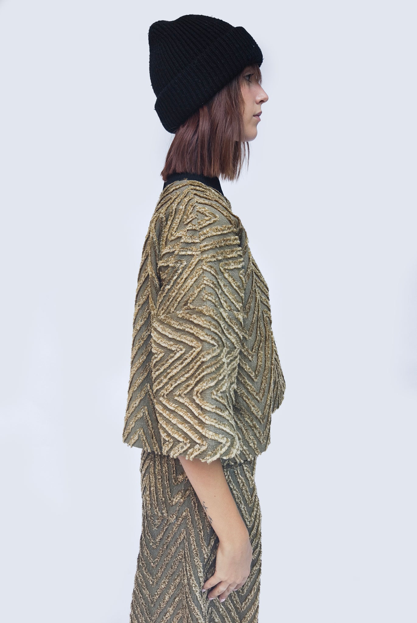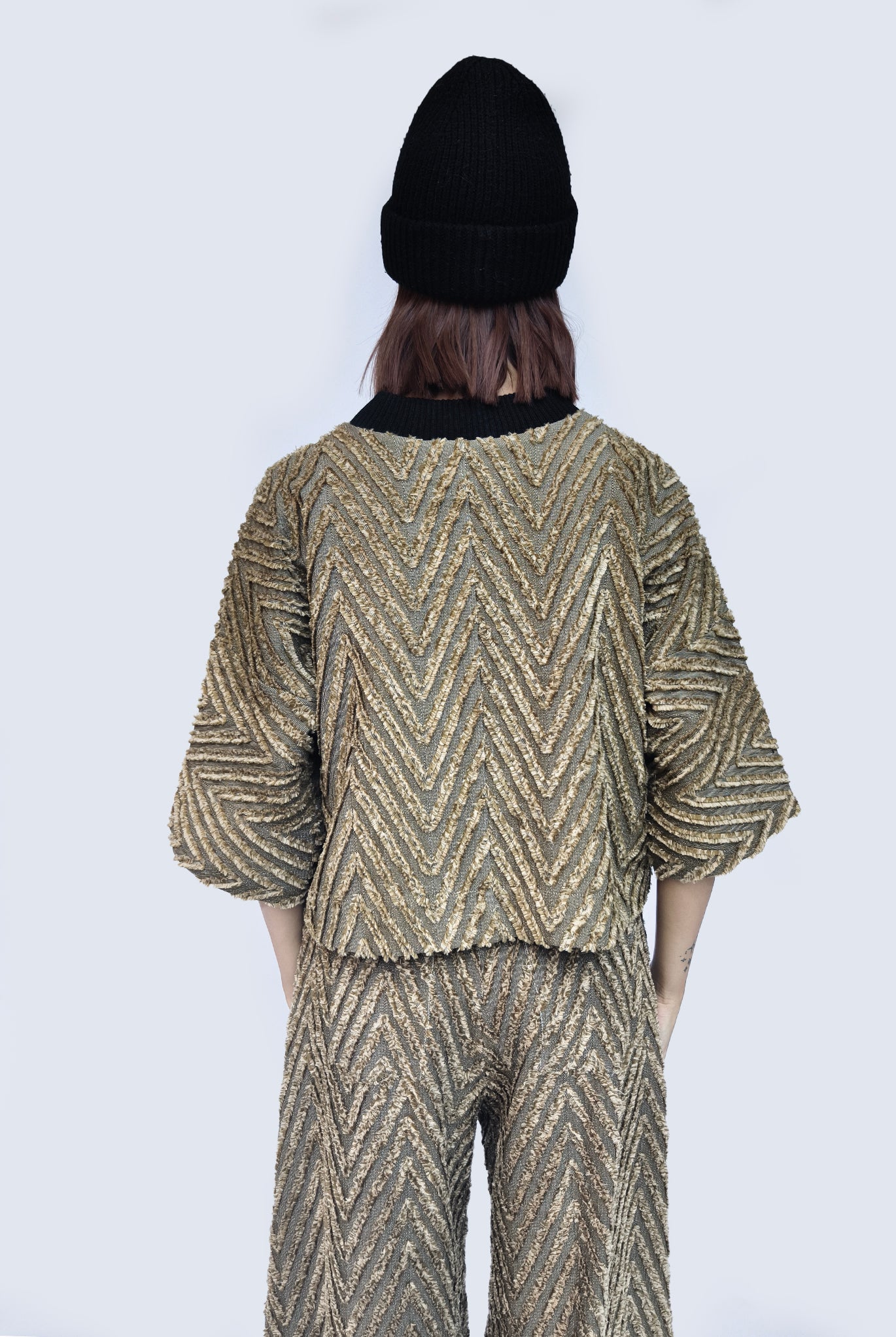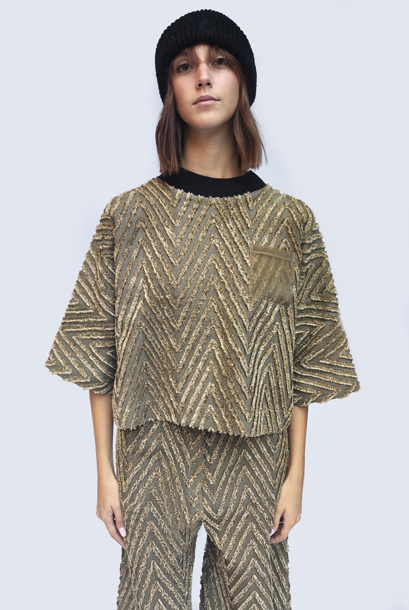 T-shirt boxie in tessuto spigato colore militare. Collo a contrasto in costina. Spalla scesa e manica kimono. Tasca in organza applicata sul davanti, lato cuore.