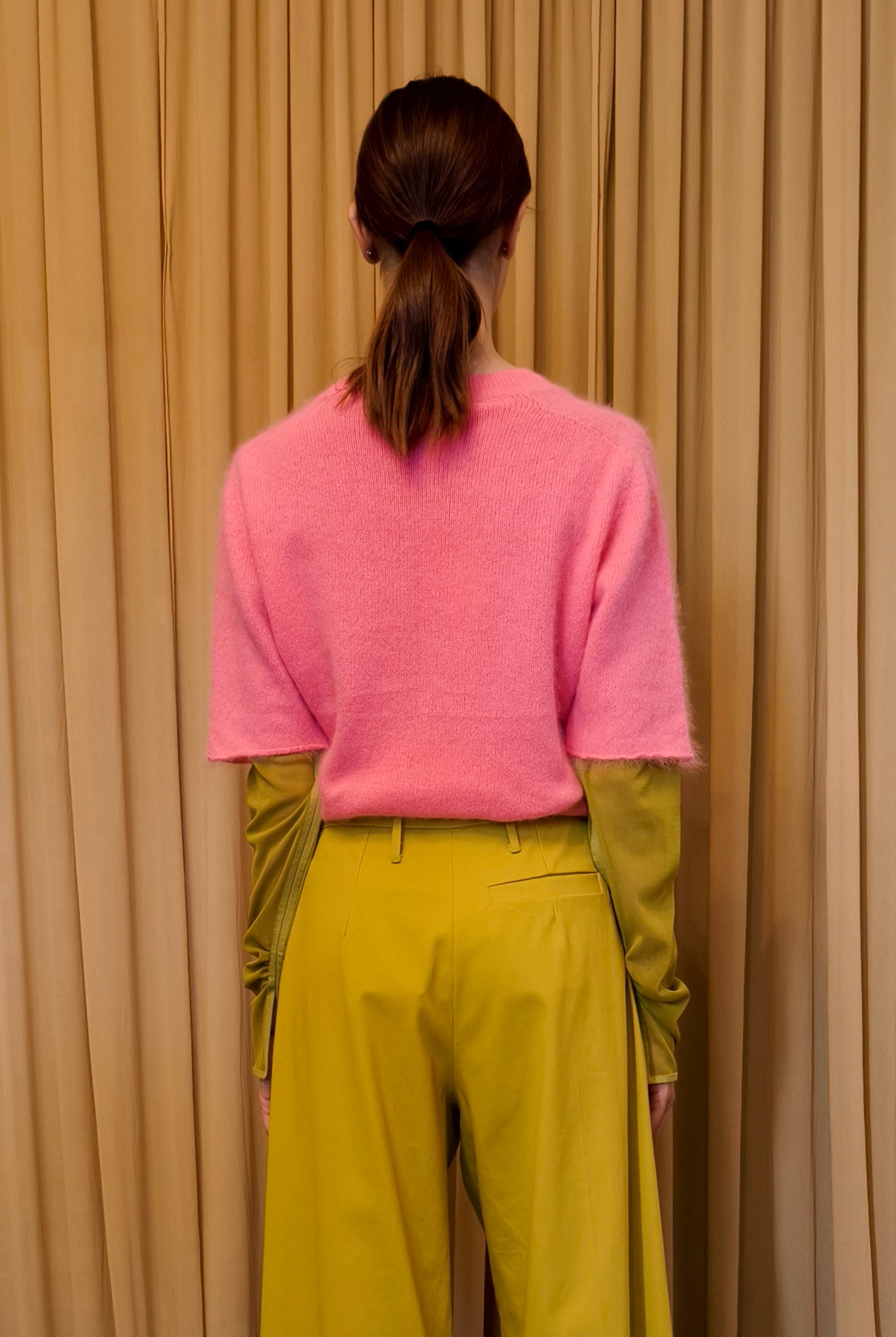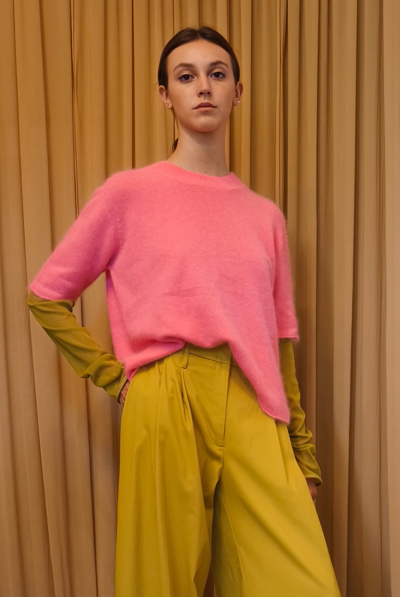 T-shirt girocollo a mezze maniche rosa fluo, in angora e lana.