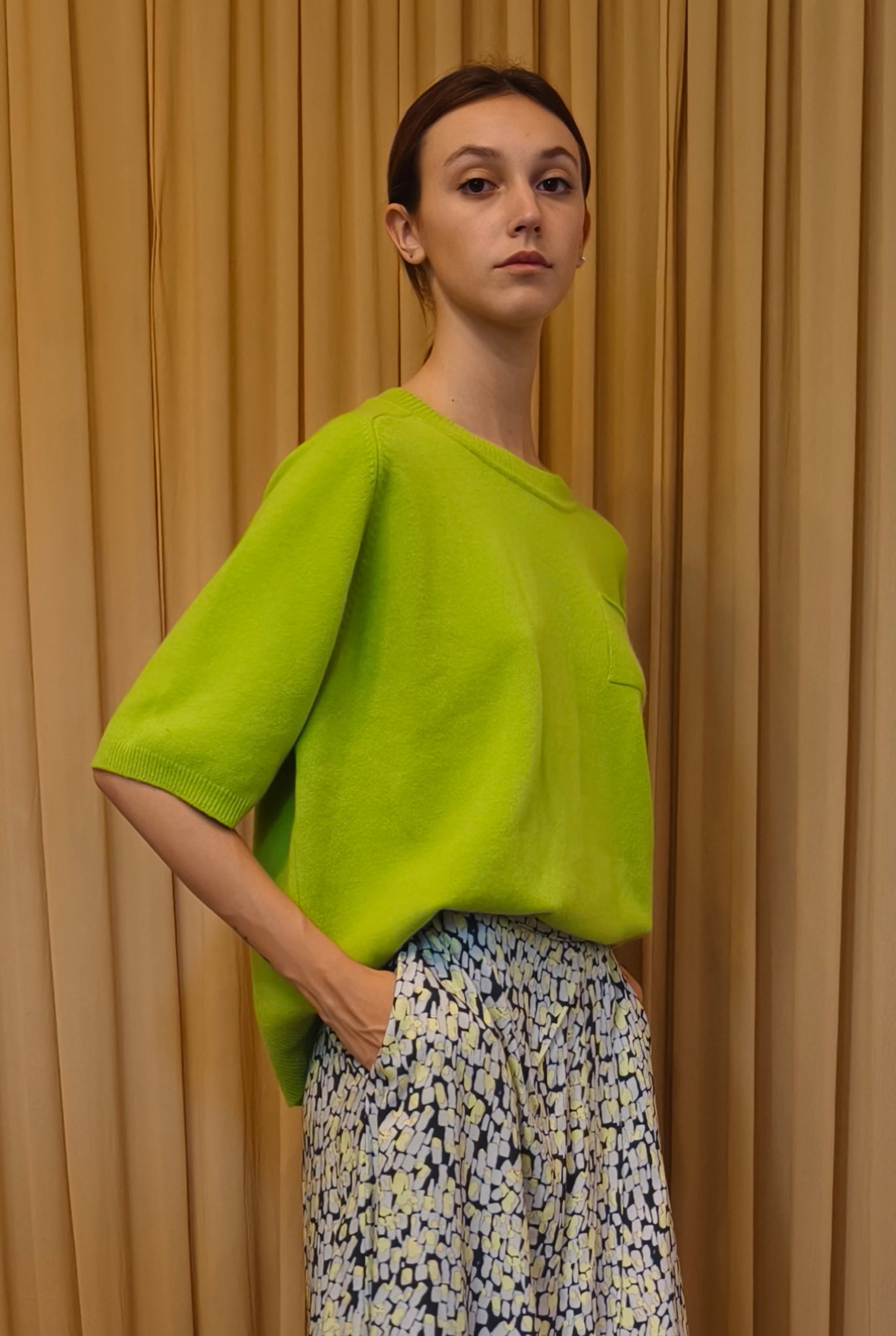 T-shirt in lana merino e cachemire con maniche 3/4 scampanate, linea a scatoletta e taschino sul cuore. Vestibilità morbida.