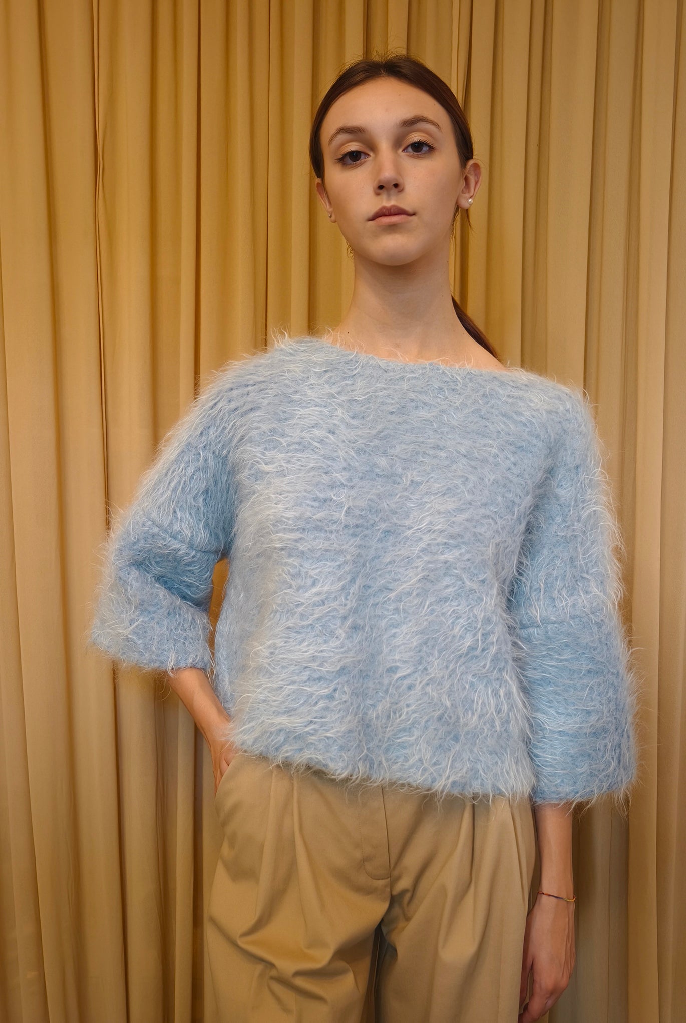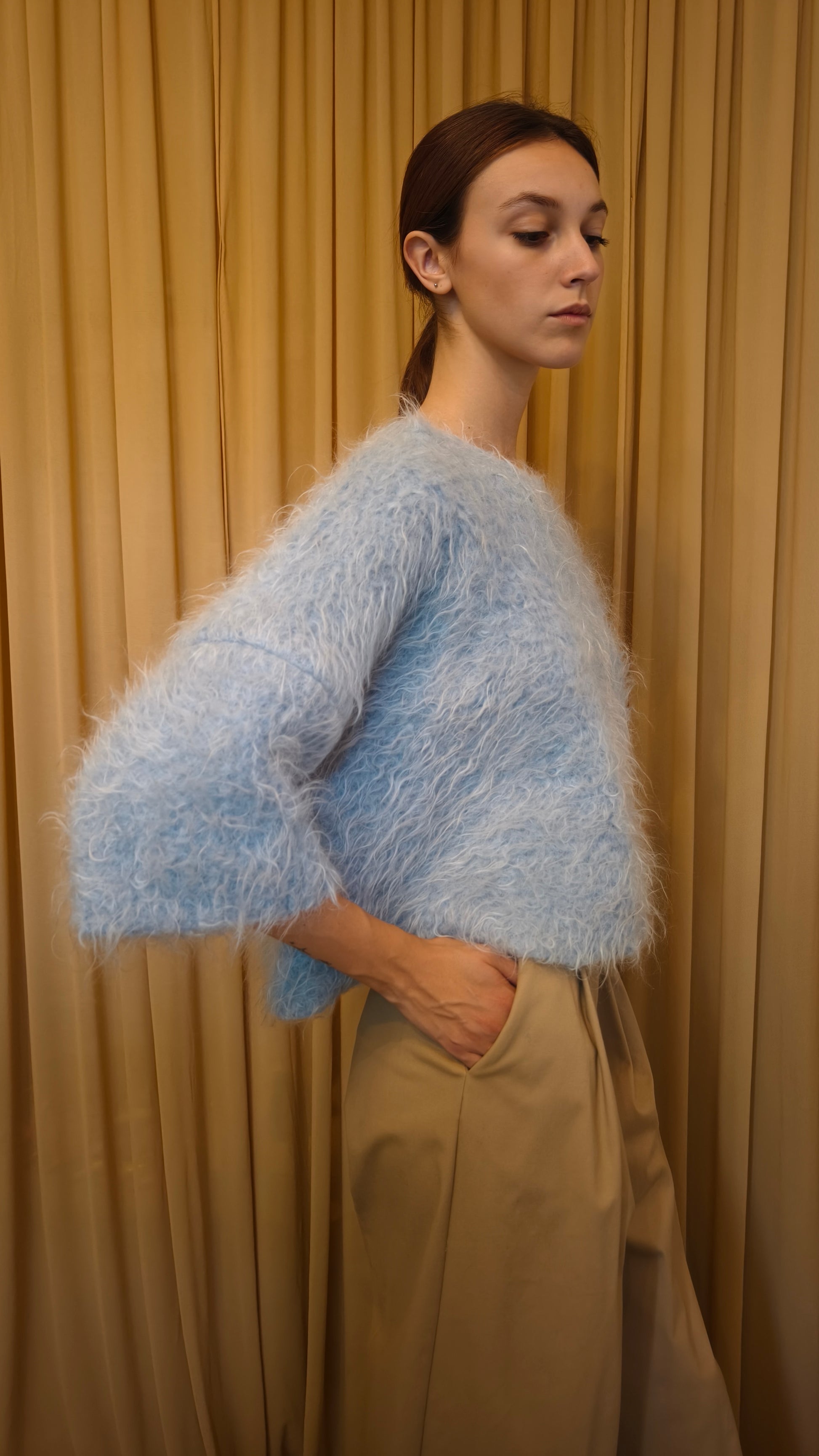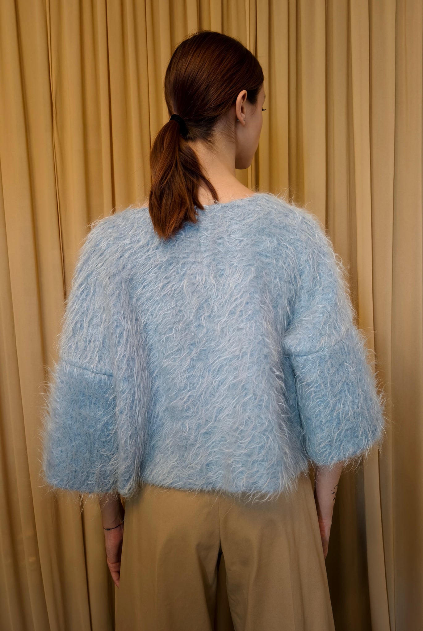 Top boxie girocollo con maniche 3/4 taglio a scatoletta. Super caldo. Disonibile in mohair nei toni del cielo.