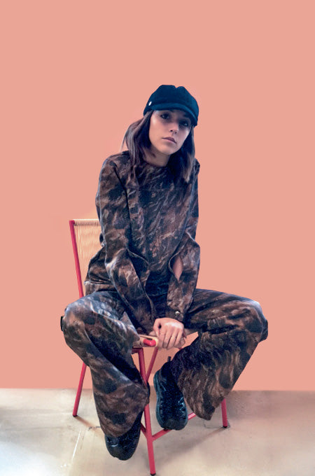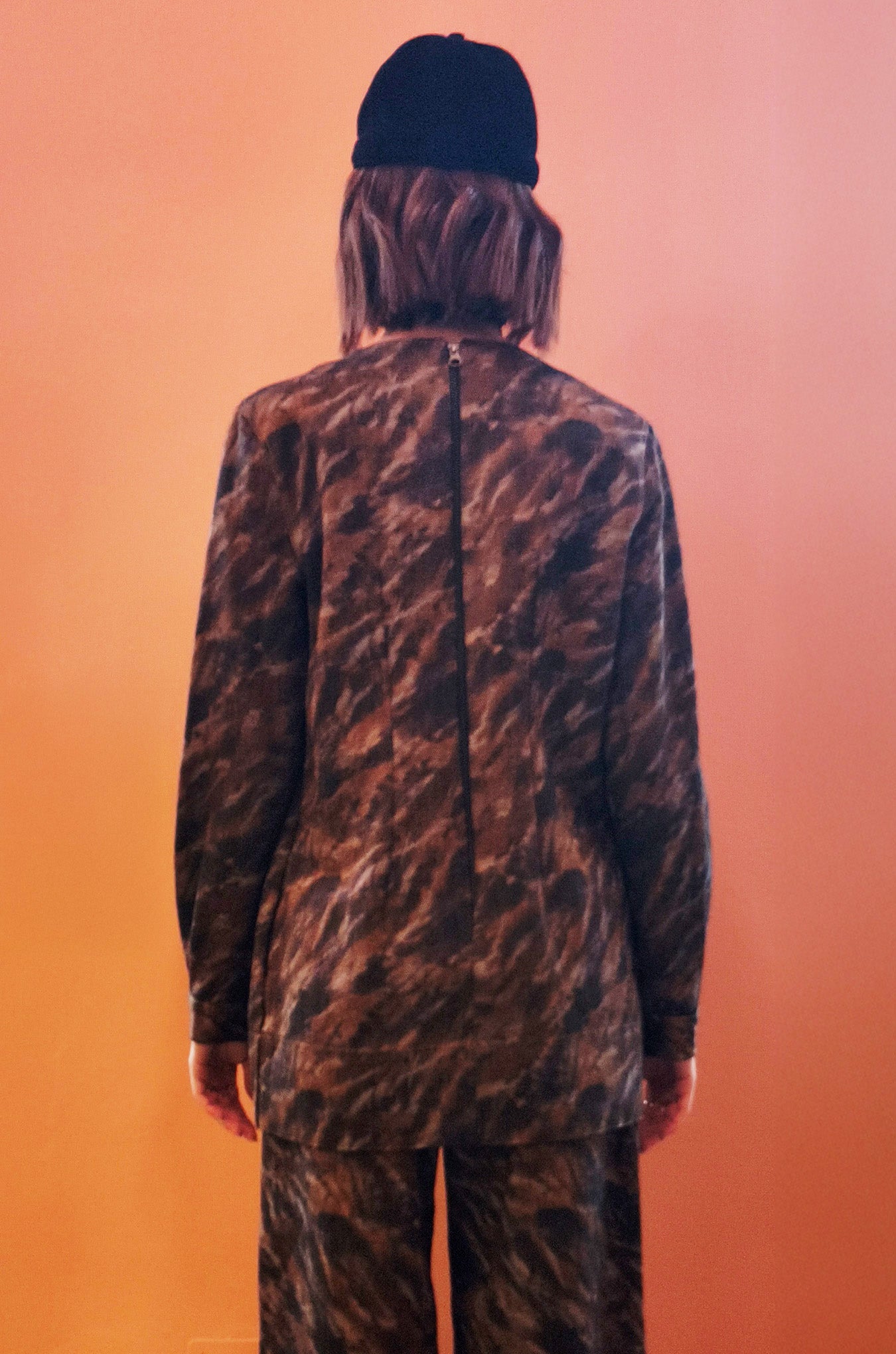 Blusa in denim stampato nei toni del marrone, grigio e nero, effetto camuflage. Chiusura sul retro tramite zip. Perfetta a completo con il suo pantalone.