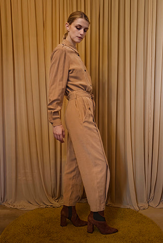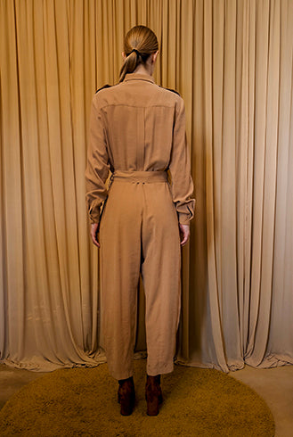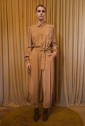 Tuta in seta lavata nei toni del marrone chiusa sul davanti tramite bottoni automatici a pressione metallici. Dettagli a camicia, colletto e manica con polsino e fessino sottile. Tasche oblique e gamba dalla linea leggermente a carota.