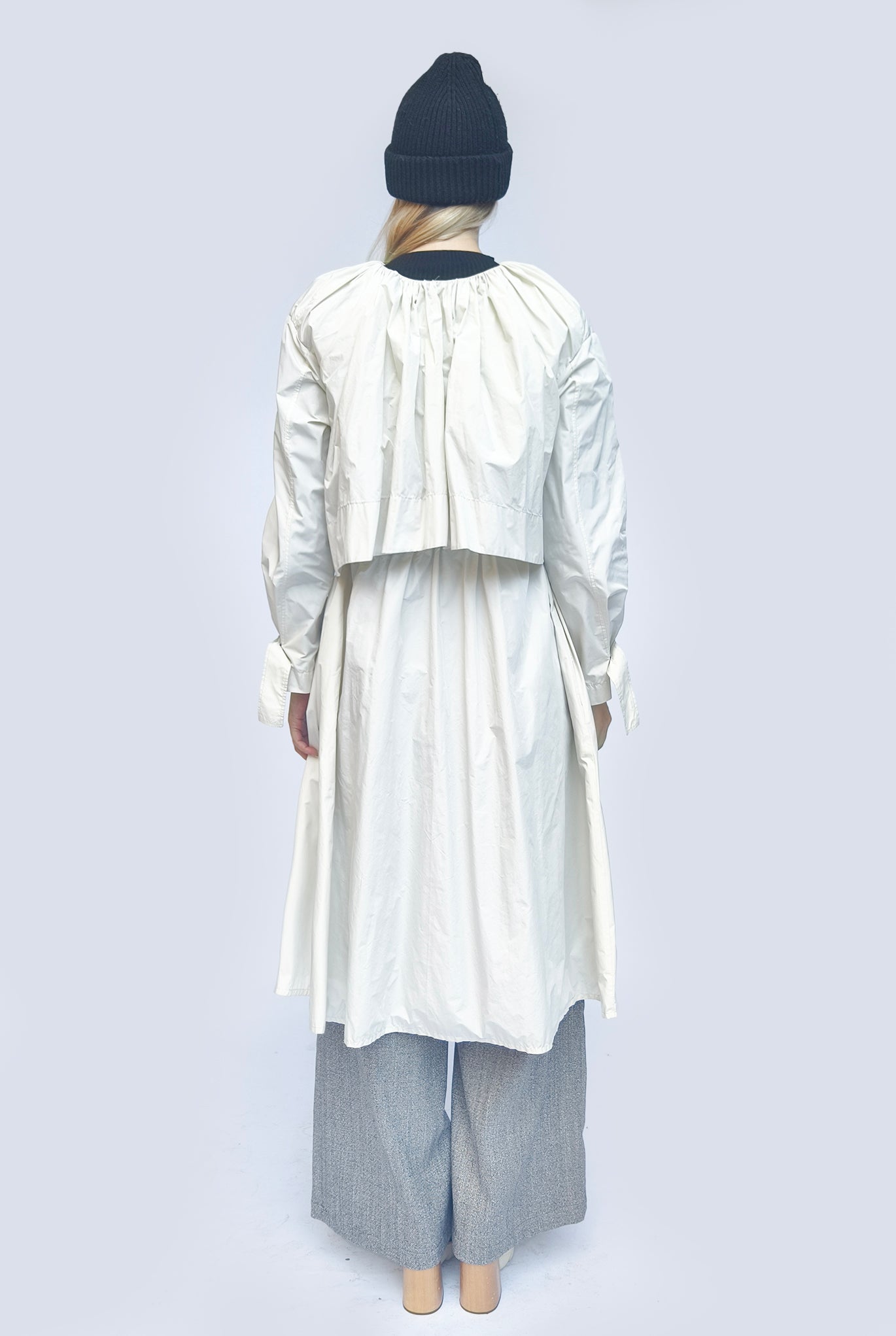 Must have di collezione, lo spolverino in tessuto tecnico fluido color bianco. Mantella con arricciature che partono dal collo a raggera. Maniche con mostrina applicata. Coulisse in vita e cerniera davanti.
