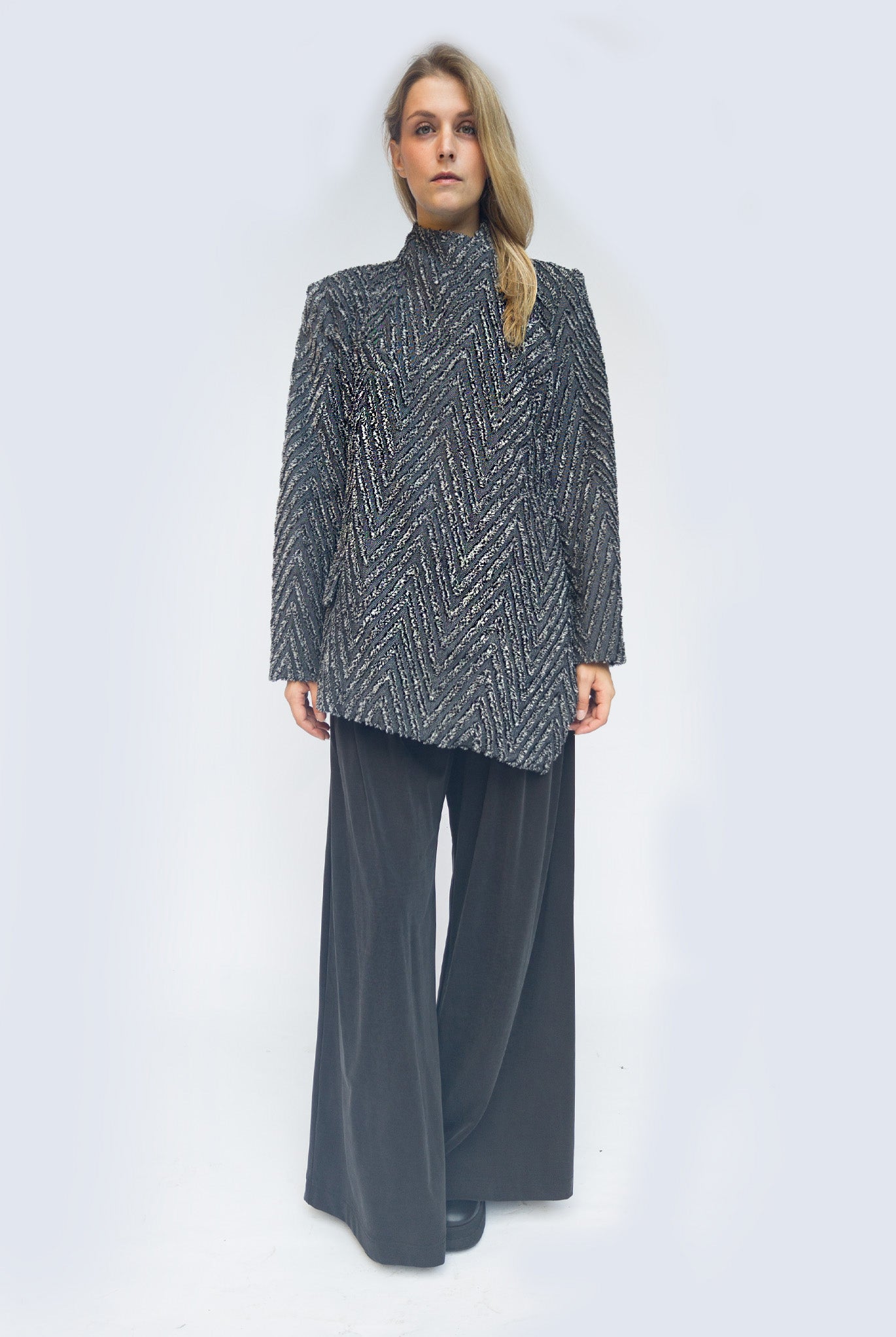 Giacca destrutturata in tessuto macro resca spigato black and white. Chiusura effetto scaldacuore, fodera in tessuto bacchettato maschile. Spallina rinforzata e nastro interno per facilitare la chiusura.
